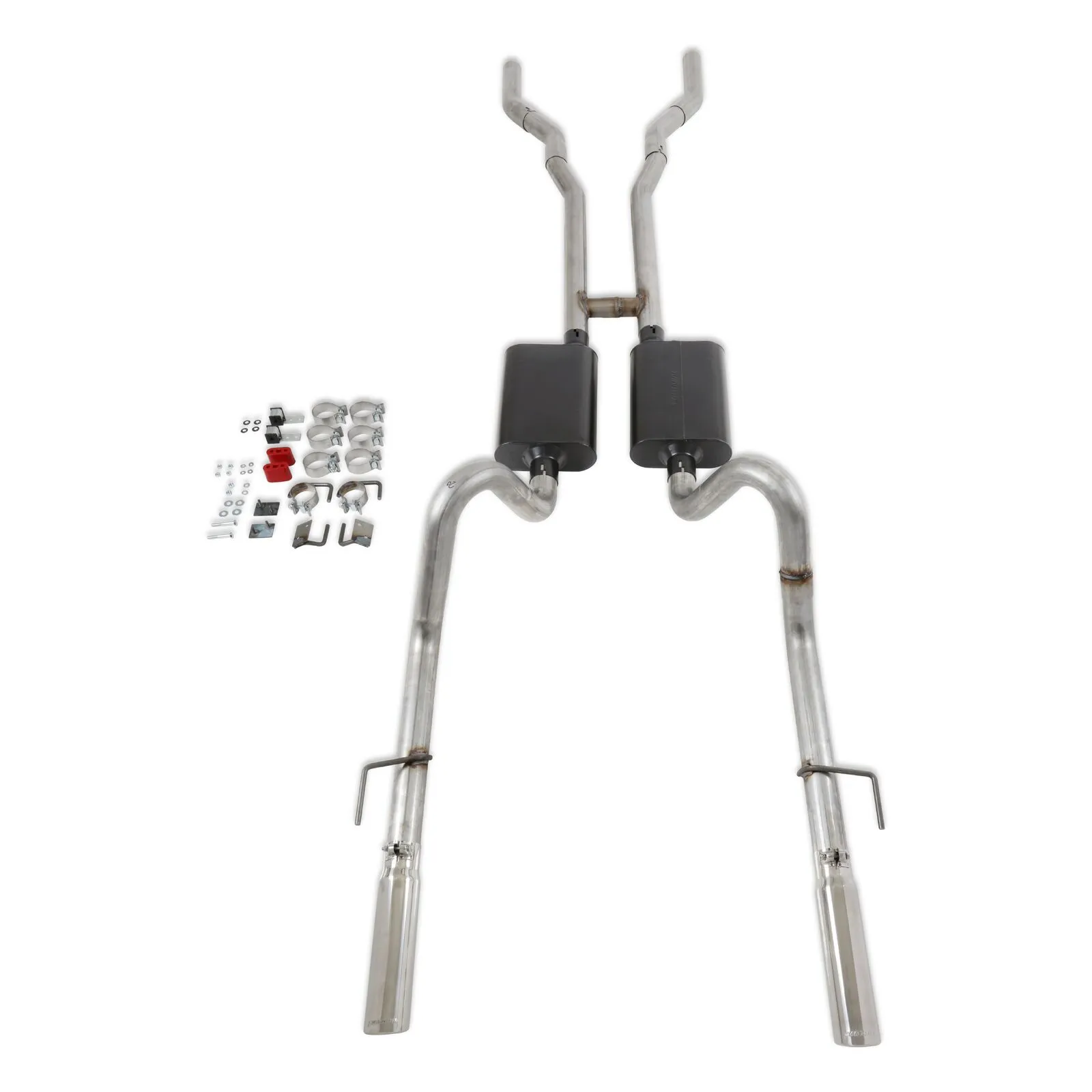 For the person who is looking for a true dual Crossmember-Back exhaust system with an moderate to aggressive exhaust tone. With an easy fit in mind, these systems are constructed from 16-gauge mandrel-bent stainless steel tubing with a built-in H-pipe crossover, a pair of specially selected Super 44 Series mufflers and includes all hangers and hardware necessary for installation. This system fits through the factory rear valance exhaust cutouts and includes a pair of 3.00-inch polished stainless steel tips. The American Thunder systems deliver a moderate to aggressive interior and exterior tone and are best suited to the enthusiast who wants their performance to be heard. Like all Flowmaster exhaust systems, the benefits include improved throttle response, power and mileage. If you prefer aluminized steel construction, check out optional system# 17281. Notes: Does Not fit convertibles or cars with staggered shocks. Does Not include header reducer cones or downpipes for factory manifolds.