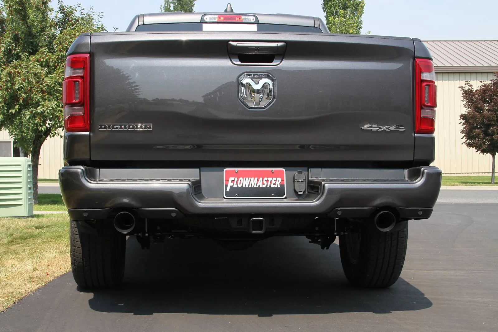The American Thunder® cat-back exhaust system for the 2019-2024 RAM 1500 (New body) with 5.7L Hemi engine and factory dual tailpipes is perfect for the person looking for a deep powerful exterior sound with all of the performance benefits that you would expect from Flowmaster®. This bolt-on emissions legal system features all mandrel-bent stainless steel tubing leading into a 50 Series™ HD muffler that was originally designed specifically for RAM Hemi engines to deliver maximum power and exterior sound quality, but with a moderately pleasant interior tone at cruising speeds. Other features include dual 3.00-inch tailpipes that clear the factory spare tire and are finished with large 4.00-inch black ceramic coated exhaust tips filling out the factory cutouts in the rear bumper. The system utilizes the factory hangers, includes all necessary parts, hardware and instructions for an easy installation you can do at home. Comes with Flowmaster's Lifetime Limited Warranty. Notes: Fits all 5.7L Hemi, 2/4 wheel drive models with 140.5, 144.6 and 153.5-inch wheelbases with 5.7 and 6.4-foot bed lengths.