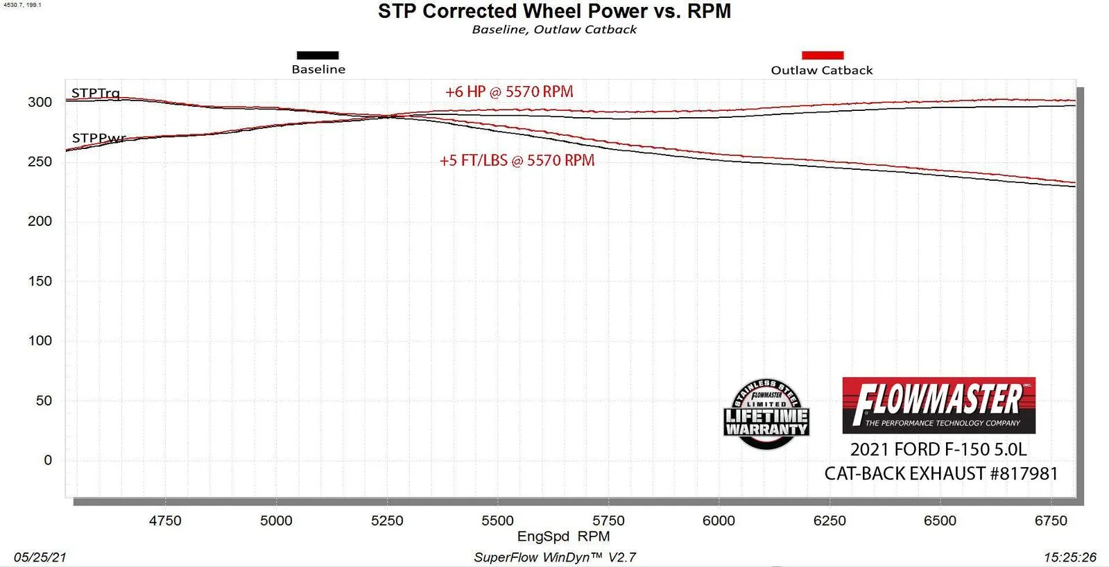 This Flowmaster® Outlaw® cat-back exhaust system is for the 2021-2024 Ford F-150 trucks with the 2.7L, 3.5L and 5.0L engines and offers maximum sound levels both inside and outside of the truck, with all of the performance benefits that you would expect from Flowmaster. This bolt-on emissions-legal system features all mandrel-bent 409 stainless steel 3.00-inch tubing flowing into a Super 10™ Series muffler and exiting into large 3.00-inch dual tailpipes for maximum sound and performance. The system comes with two sets of tailpipe exits for you to choose from, either straight out the back under the bumper, or exiting behind the rear wheels, which is ideal for towing applications. The tailpipes are finished off with a pair of large 4.00-inch black ceramic-coated stainless steel tips and the exhaust system is covered by our Lifetime Limited Warranty. Designed for an easy fit, this system includes all necessary parts and hardware for installation. Note: Fits 2/4 wheel drive.