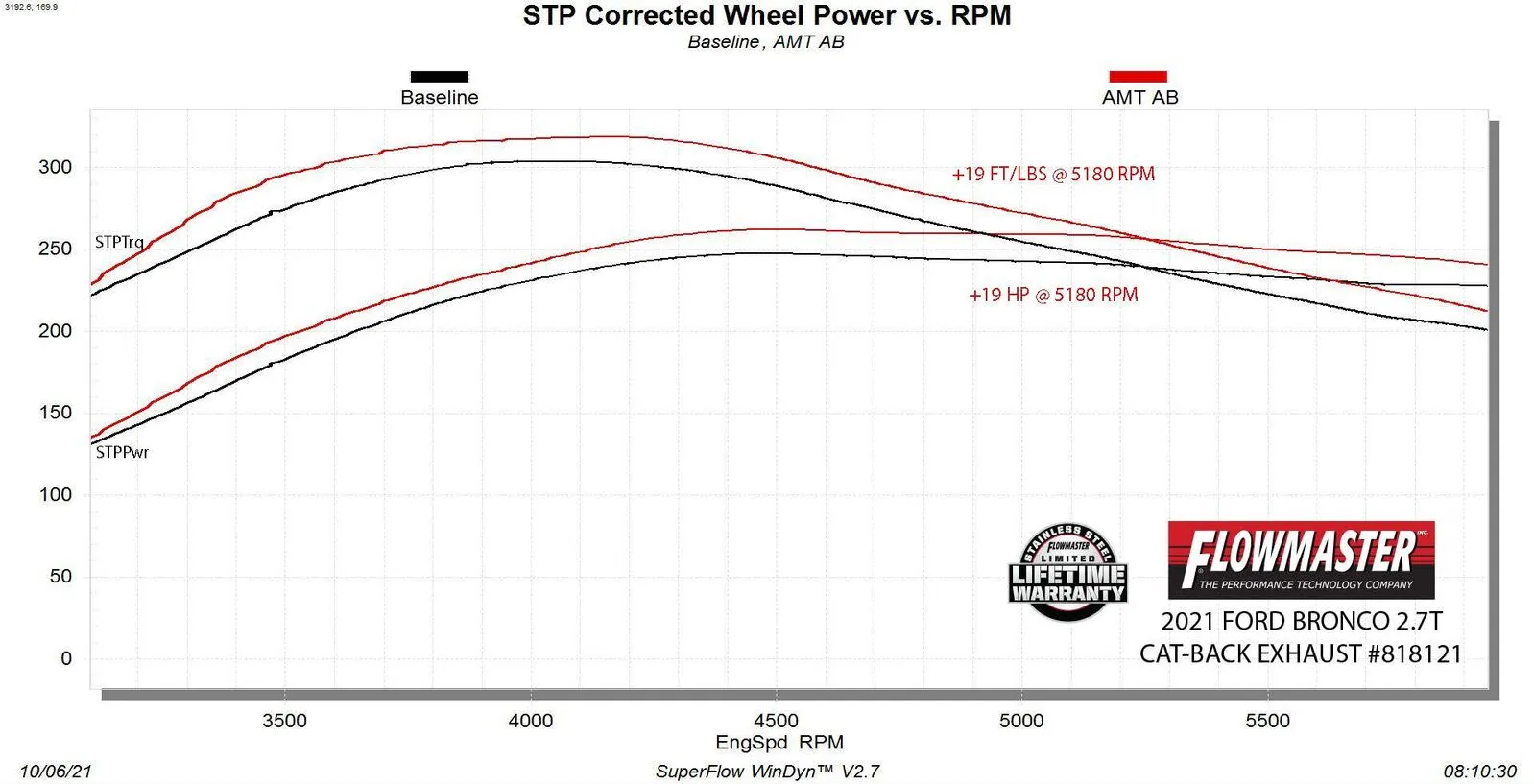 Looking for the perfect balance between a mild tone while cruising and at idle, but aggressive tone under throttle all while having no drone? The American Thunder axle-back exhaust system is perfect for the daily driven 2021-2024 Ford Bronco with the 2.3 or 2.7-liter engine. This system uses a tuned 60 Series style muffler for an aggressive to moderate exhaust tone and increased performance. Maximum dyno gains of 19 hp and 19 lb-ft. were measured at the rear wheels. 3.00-inch mandrel bent 409 stainless steel tubing is used to maximize exhaust flow and durability. A polished 3.00-inch stainless steel tip is used to add a custom look to this iconic vehicle. All of the necessary hardware is included and factory mounting locations are used for an easy installation. Backed by Flowmaster's Lifetime Limited Warranty.