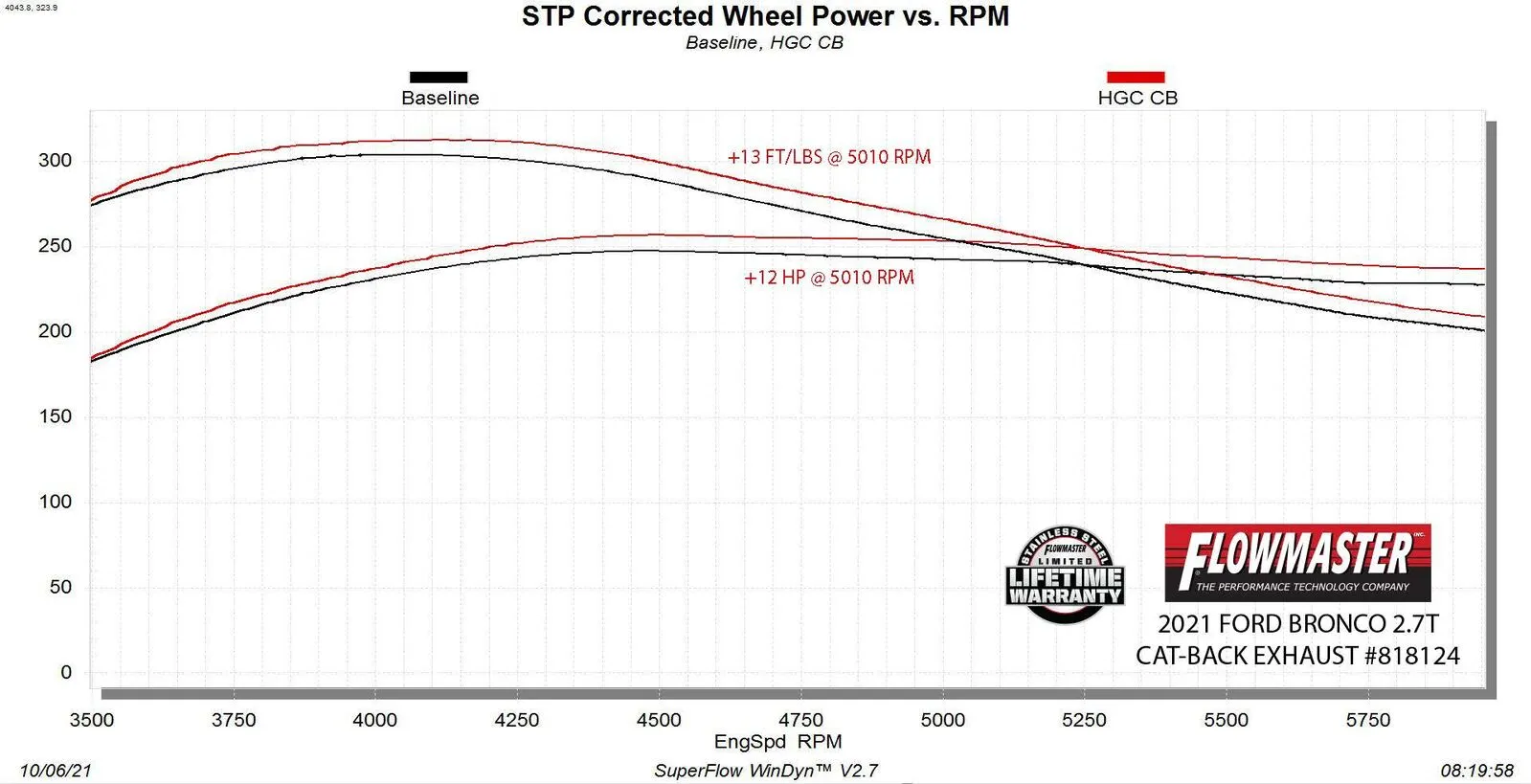 Flowmaster introduces our Outlaw High Clearance cat-back exhaust system for the 2021-2024 Ford Bronco with the 2.3 or 2.7-liter engine and 4 doors. This system replaces the stock muffler with straight pipe for an aggressive exhaust tone and increased performance. Maximum dyno gains of 12 hp and 13 lb-ft. were measured at the rear wheels. 3.00-inch mandrel bent 409 stainless steel tubing is used from the factory mid-pipe flange back to maximize exhaust flow and durability. This step up from the factory pipe size will help maximize gains from additional engine upgrades. This system keeps the exhaust tip tucked up higher in the rear of the vehicle for better departure angle and minimizes the chance of hanging up on the exhaust when aggressively off roading. A polished 3.00-inch stainless steel tip is used to add a custom look to this iconic vehicle. All of the necessary hardware is included and factory mounting locations are used for an easy installation. Backed by Flowmaster's Lifetime Limited Warranty.