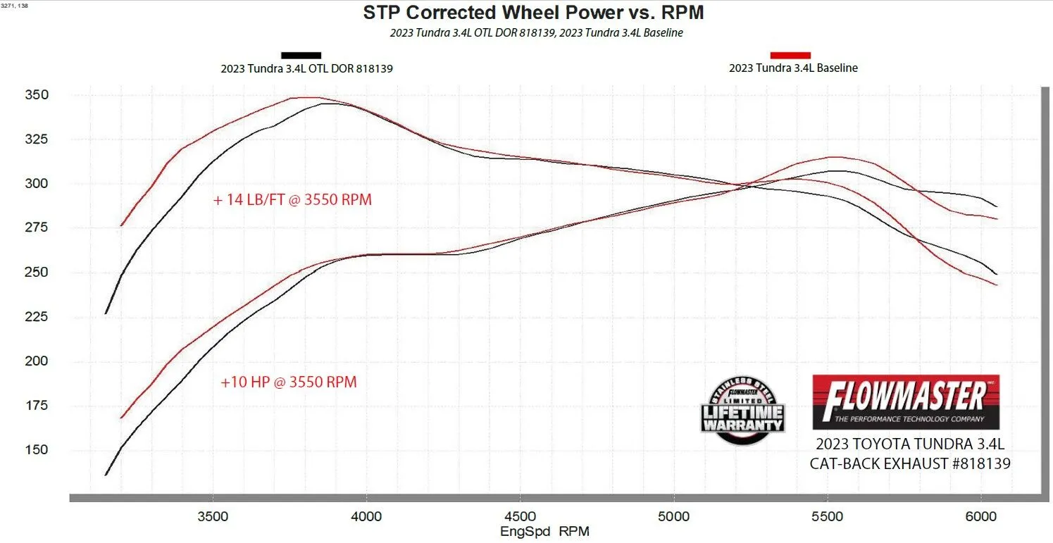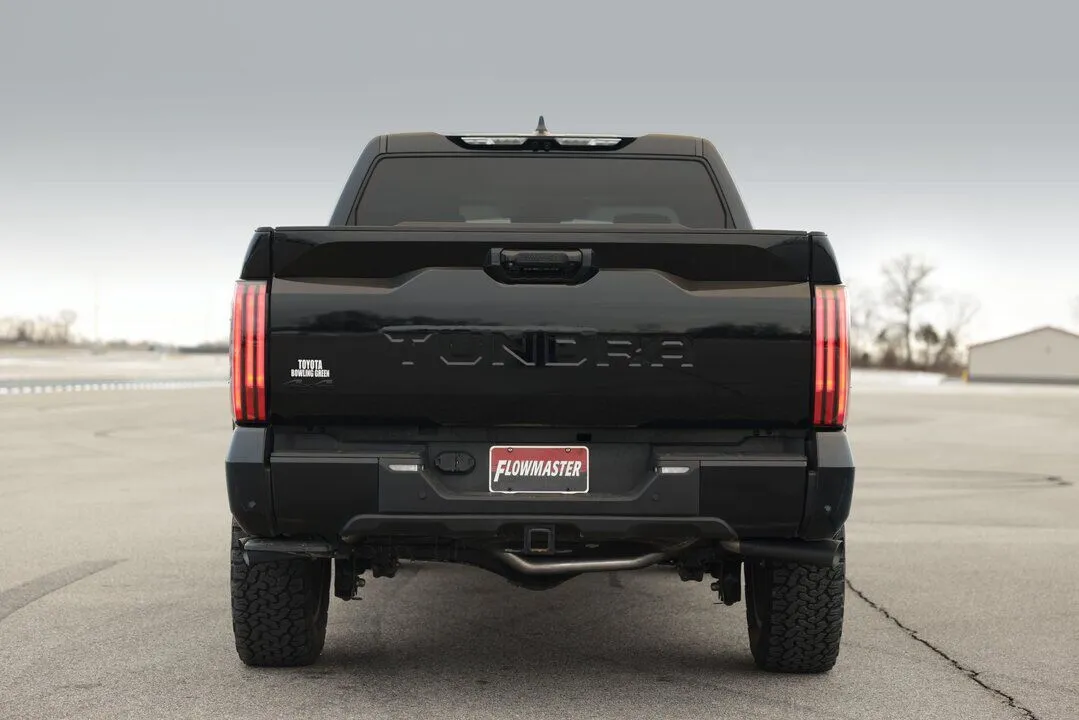 This Flowmaster® Outlaw cat-back exhaust system is for the 2022-2024 Toyota Tundra trucks with the 3.4-liter engine, including hybrid models. This system is manufactured using durable 409 stainless steel tubing and is mandrel bent for better exhaust gas flow. A Specially tuned Outlaw muffler is used for an aggressive sound level outside with minimal interior resonance inside the cab. Dyno results show an improvement of 10 hp and 14 lb/ft of torque at the rear wheels over the stock exhaust. This system uses dual 3.5-inch black ceramic coated tips that can exit dual out the rear or dual out the side. The system uses all the existing factory hanger locations and includes installation instructions and all necessary hardware for an easy installation that you can do at home. Backed by Flowmaster's Lifetime Limited Warranty.