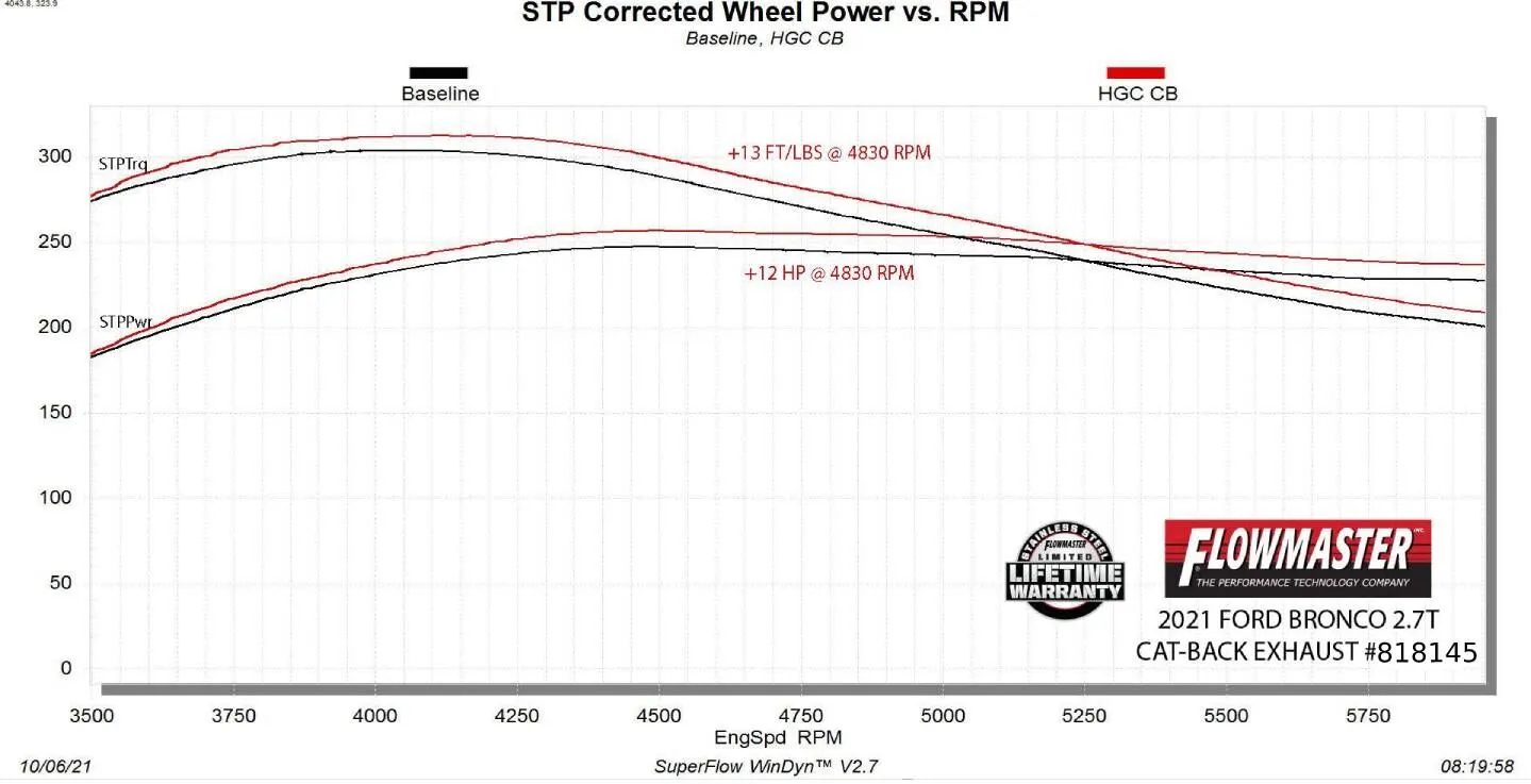 • Max increases of up to 12 hp and 13 lb-ft over the stock exhaust at the rear wheels