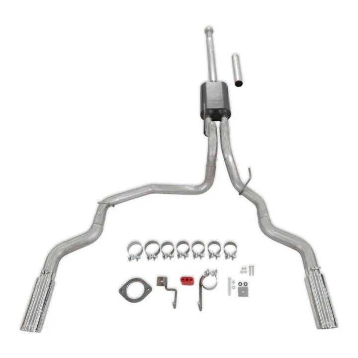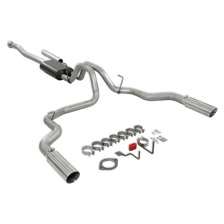 Flowmaster introduces our Force II stainless steel cat-back exhaust system for the 2021-2024 Ford F-150 trucks with the 2.7, 3.5, and 5.0-Liter engines. This system uses the Super 50 series muffler for a moderate to mild sound level and increased performance. This 3 chamber muffler has a resonance chamber to reduce interior sound, ideal for towing or long haul situations. Mandrel bent 3.00-inch to dual out 2.50-inch 409 stainless steel tubing allows for maximum exhaust flow and durability. This system uses larger 4.00-inch polished stainless steel tips for a custom look. All of the necessary hardware is included, and factory-mounting locations are used for an easy installation. Backed by Flowmaster's Lifetime Limited Warranty.