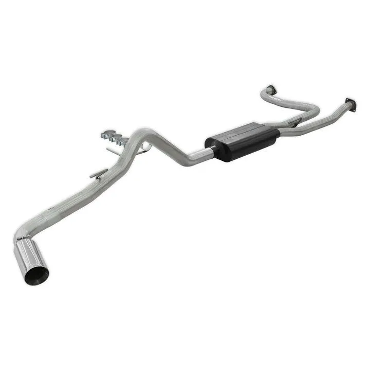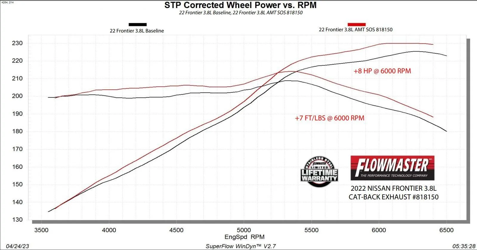 This Flowmaster® American Thunder® cat-back exhaust system for the 2022-2024 Nissan Frontier with the 3.8-liter engine is manufactured using durable 409 stainless steel throughout and features 2.50 and 3.00-inch mandrel bent pipes for better exhaust gas flow. A Super 50 series muffler is used for an aggressive to moderate sound level and maximum performance. Gain up to 8 hp and 7 lb-ft of torque at the rear wheels over stock. This single exit system has a 4.00-inch polished stainless steel tip with the Flowmaster logo embossed in it, for added style and a custom look. This system uses all the existing factory hanger locations and includes installation instructions and all necessary hardware for an easy installation that you can do at home. Backed by Flowmaster's Lifetime Limited Warranty.