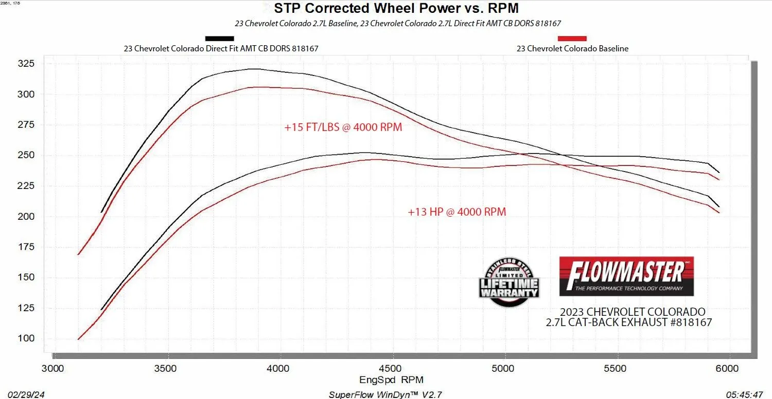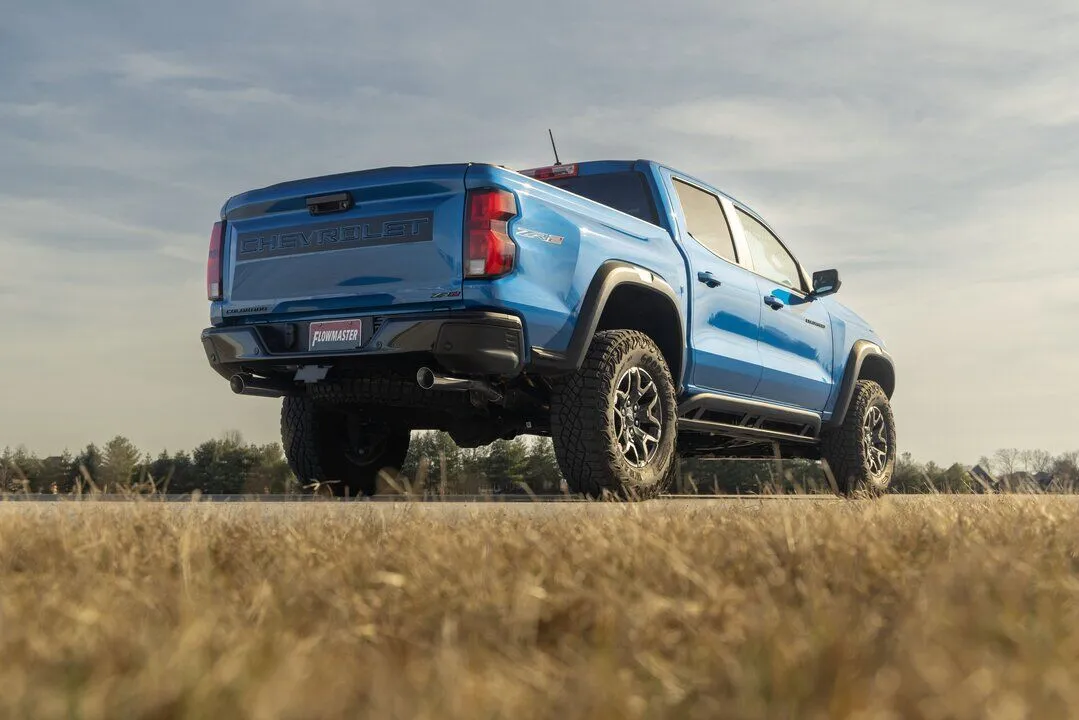 This Flowmaster® American Thunder® cat-back exhaust system is for the 2023-2024 GM Colorado/Canyon with the 2.7-liter turbo engine. This system is manufactured using durable 409 stainless steel tubing and features 3.00-inch to dual 2.50-inch mandrel bent pipes for better exhaust gas flow. A 50 Series Big Block muffler is used for an aggressive to moderate sound level and maximum performance. Maximum increases on the dyno revealed 13 hp and 15 lb-ft at the rear wheels. This system exits out the rear or side of the truck with dual 3.5-inch polished stainless steel tips for added style. The system uses all the existing factory hanger locations and includes installation instructions and all necessary hardware for an easy installation that you can do at home. Backed by Flowmaster's Lifetime Limited Warranty.