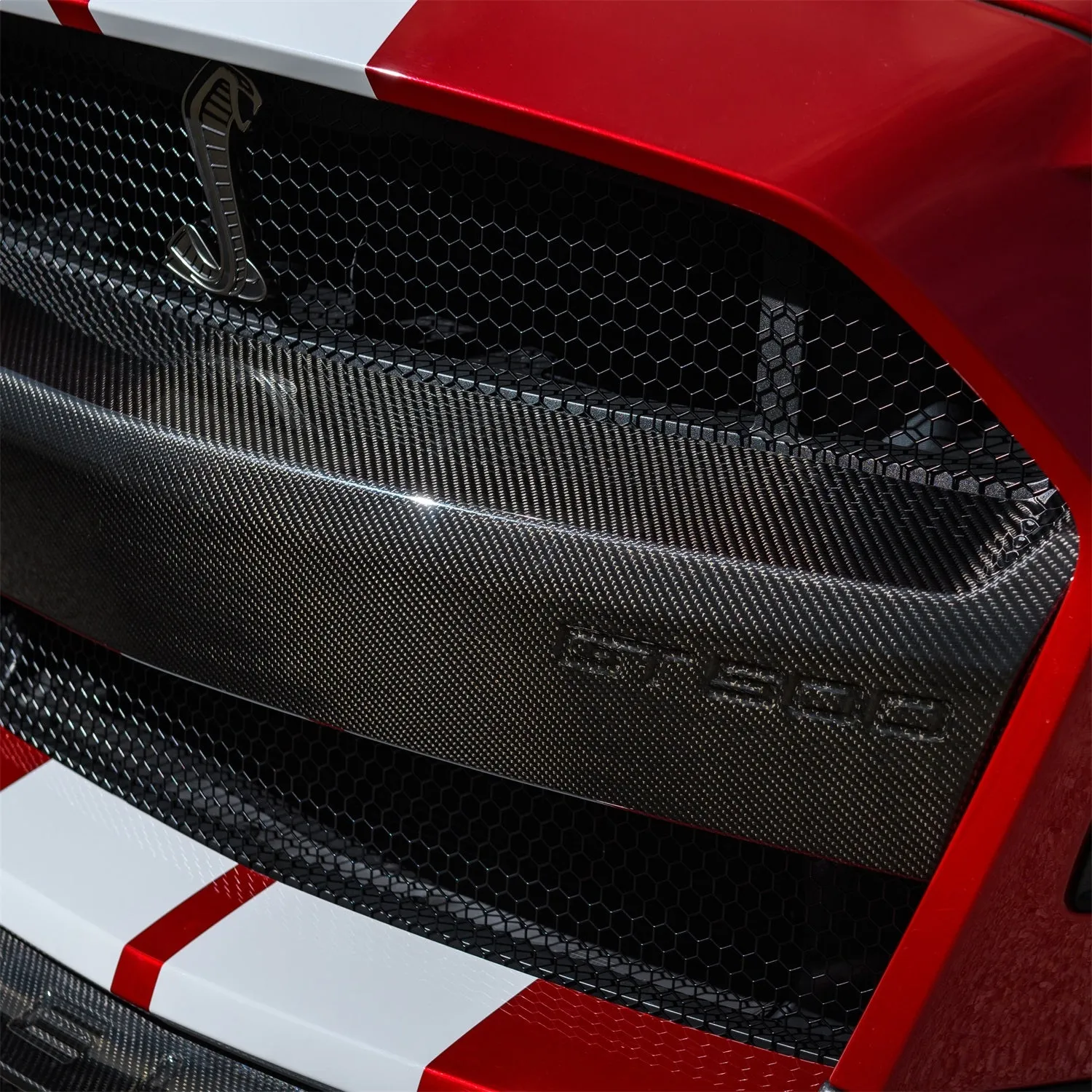 Customize the appearance of your 2020-2021 Shelby GT500 with the Ford Performance Front Bumper Carbon Fiber Insert. Fits all 2020-2021 Shelby GT500, direct Replacement of OE component, dry Carbon Fiber clear-coated and maintains factory tow hook attachment strategy.