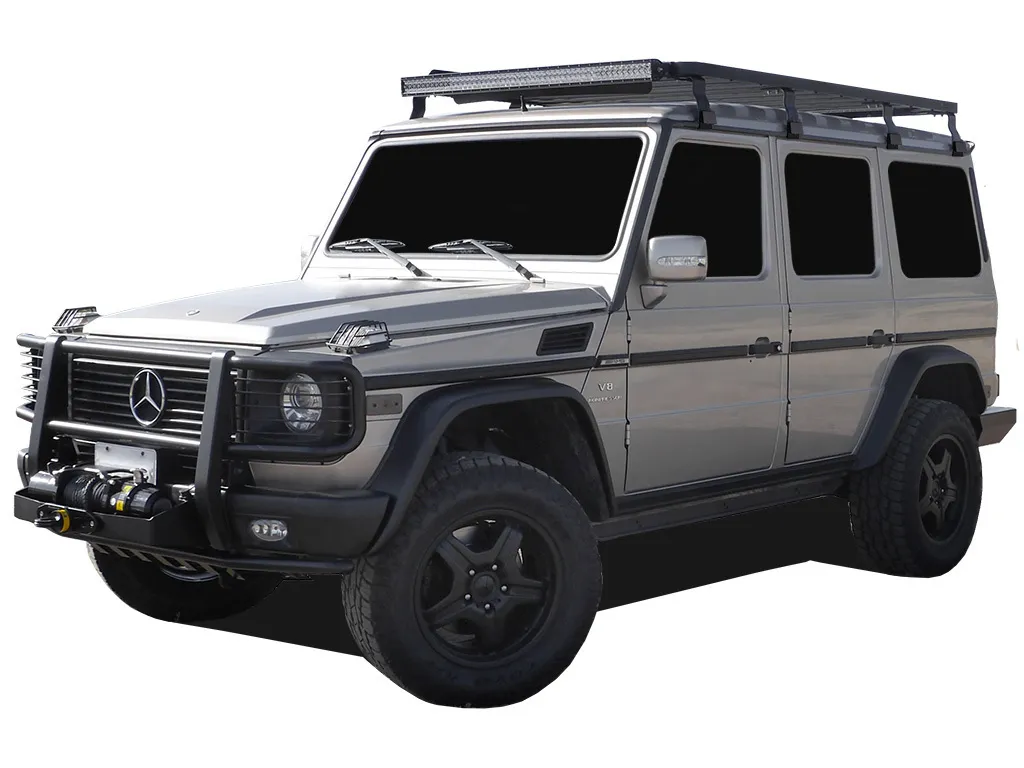This 2166mm/85.3" long full-size Slimline II cargo carrying roof rack kit for the Mercedes Gelandewagen G Class contains Slimline II Tray and Wind Deflector, as well as 8 Gutter Mount legs for mounting the Tray to the vehicle. This taller kit has space for mounting the Front Runner tables or other compatible accessories under the rack. It installs easily with no drilling required.