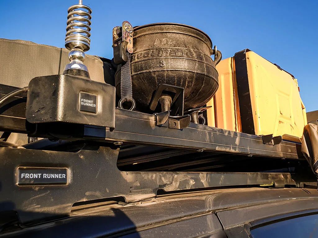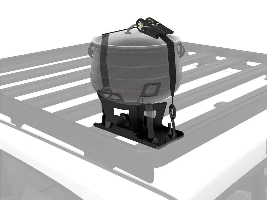 The Front Runner Potjie Pot/Dutch Oven Carrier is a safe and durable means of transporting your potjie pot/dutch oven where ever your travels may take you.The potjie pot/dutch oven is placed centrally into the bracket with the three legs fitting into the holes in the three protrusions extending from the centre of the bracket. The supplied ratchet strap threads through the lid of the pot and fixes to pre-drilled points on the bracket.