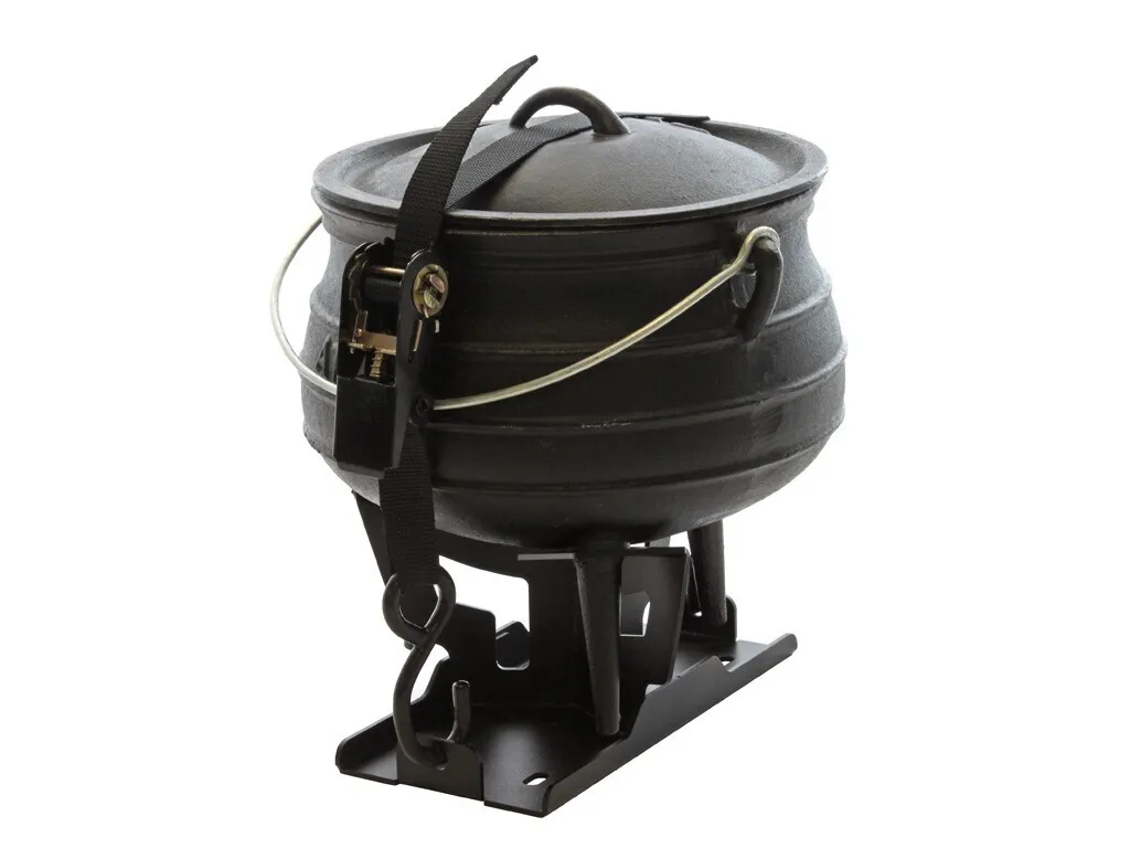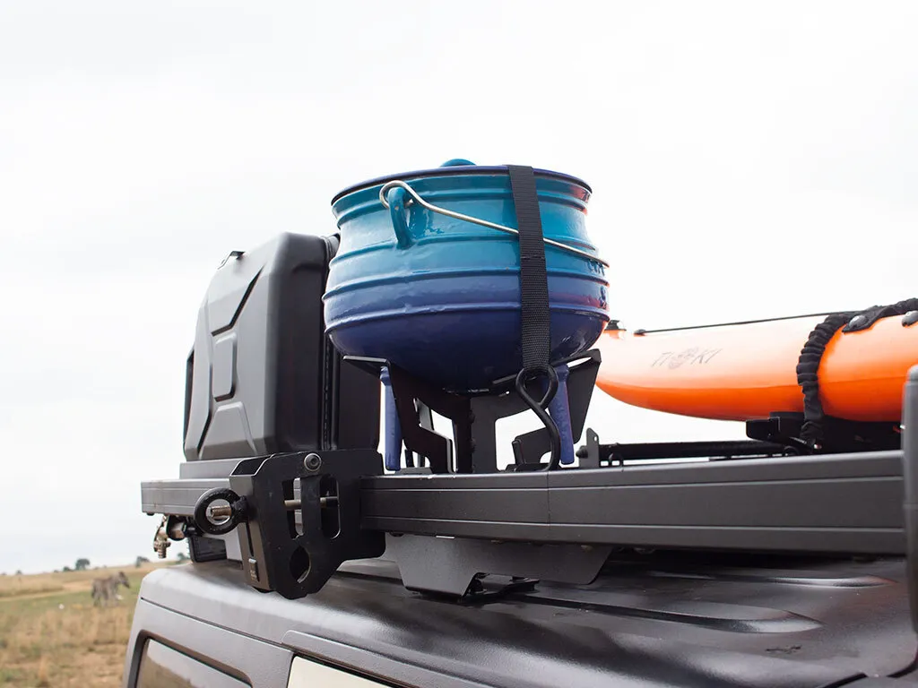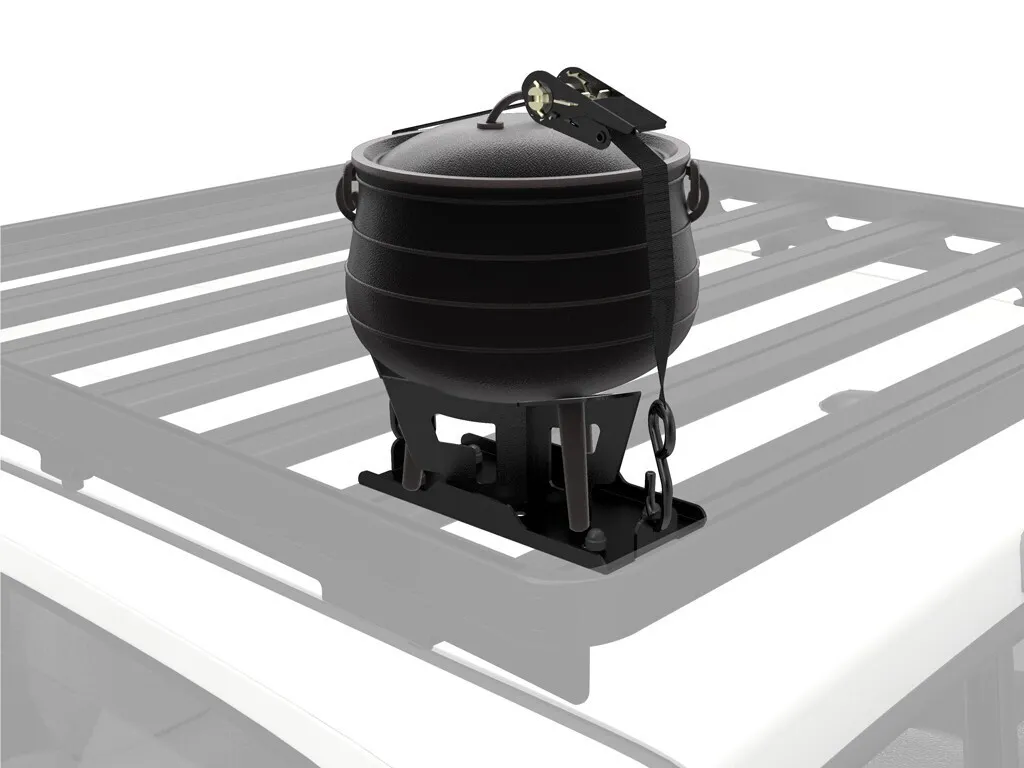There’s no better place to keep potentially hot, grimy, dirty, and cumbersome camp kitchen supplies than up and out of the way, outside the vehicle.The Front Runner Potjie Pot Carrier offers a sensible way to travel with a potjie pot.The potjie pot is secured in the bracket by the three legs. The supplied ratchet strap threads through the lid of the pot and fixes points on the bracket.The #3 cast iron pot holds 7.8L / 2.1 Gallons. The round shape and cast iron allows the heat to flow evenly around the sides and maintain liquids at the lowest point to keep them from burning. The lid has a deep lip for holding hot coals.The high strength steel carrier is finished with the same durable, weather resistant powder coating as the Front Runner Slimline II Rack.Like all Front Runner rack accessories, the installation is simple. Just slide the bolts into the t-slots of any Front Runner Rack Tray, set down the carrier, then add nuts and tighten.