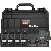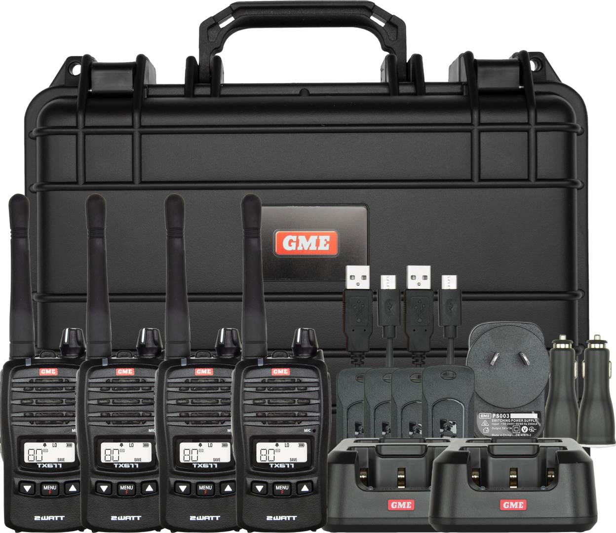 The TX677QP includes four TX677 radios, two convenient twin desktop chargers, two 12V DC vehicle chargers, an AC adaptor, and a rugged heavy-duty carry case.