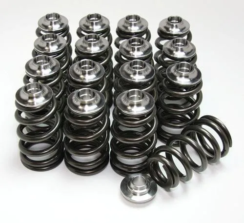 GSC has two options for retainers you can either have Chro-Molly or Titanium do to the type of abuse a street cars valve train sees we suggest Chro-Molly and Ti for race car applications. The Chro-Molly will last just as long as the stock units that they will replace. Unlike Titanium these will not become brittle over time. They are only a few grams heavier than Titanium and will not affect performance. GSC Chro-Molly retainers are universal to use with either our single valve springs or our dual springs. The single valve springs do not require a new seat or different seals where as the duals will. A set of valve springs can be changed in a matter of 2 hours with the correct tools, and is the best insurance a car with upgraded cams can have. The single springs have been tested higher but we suggest a max rev limit of 8500rpms. If higher revs or prolonged periods of revving i.e. road race applications, we suggest going to our dual springs which is more stable at higher rpms and can be revved to 10500rpms. The Single Spring kit includes: Single springs 78@39.6 with either Titanium or Chro-Molly Retainer. *Beehive Spring Set* GSC Power-Division Beehive springs feature some of the most impressive manufacturing techniques in the industry. Our beehive spring uses an ovate wire which utilizes advanced material heat treatment methods for superior load loss capabilities. What this means to you is our spring has the highest level of spring load retention while still maintaining good fatigue threw out the life of the spring. The retainer side of the valve spring has a smaller diameter to greatly reduce coil spring surging and improve valve control even at extreme rpm levels. Only the best materials go into the GSC Power-Division Beehive valve spring. Each batch is scrutinized for tensile strength properties, ductility, inclusion content, and fatigue toughness. Each new design is tested to 9,000RPMS so you can rest assure that you have the best possible valve spring set available on the market. The GSC Beehive spring is a factory replacement and will use your stock OEM retainer and Valve Seat to ensure an easy install.