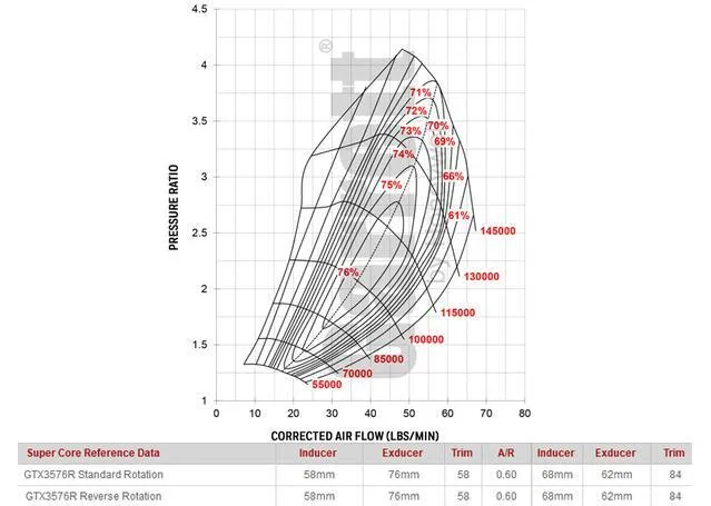 A new ten-blade GTX Gen II compressor wheel designed using proprietary Honeywell computer simulation software gives the GTX3584RS the ability to create more air mass flow, allowing the enthusiast a wider range of power output when tuning the vehicle. A larger, 0.72 A/R compressor housing allows the compressed air flow to circulate into the engine more efficiently than other mid-frame turbochargers. The 8mm dual ceramic ball bearing cartridge provides optimal turbo response and reliability through its reduction in shaft motion. V-band and hose connection compressor outlet options are also now offered.