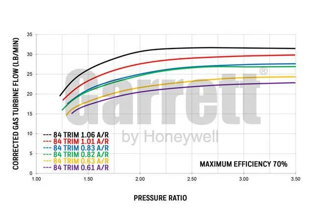 A brand new high horsepower turbine wheel flows exhaust gasses at a higher, more efficient rate than other GT and GTX turbine wheel designs. The new turbine wheel design allows for higher exhaust gas flow which increases aerodynamic efficiency compared to the previous design. New hi-flowing, stainless steel turbine housings help decrease backpressure and range in size from 0.83, 1.01, and 1.21 A/R. These compact turbine housings are unique only to the GTX3584RS meaning they are not interchangeable with other GT/GTX35 products because of the new turbine wheel.