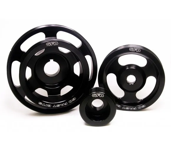 GFB lightweight underdrive pulley kit (part number 2014) is made from anodized aircraft-grade billet 6061-T6 aluminium and offers sharper throttle response and faster acceleration. Kit includes: crank, alternator and power steering pulleys, and 1 belt (the original factory A/C belt can be re-used with this kit).