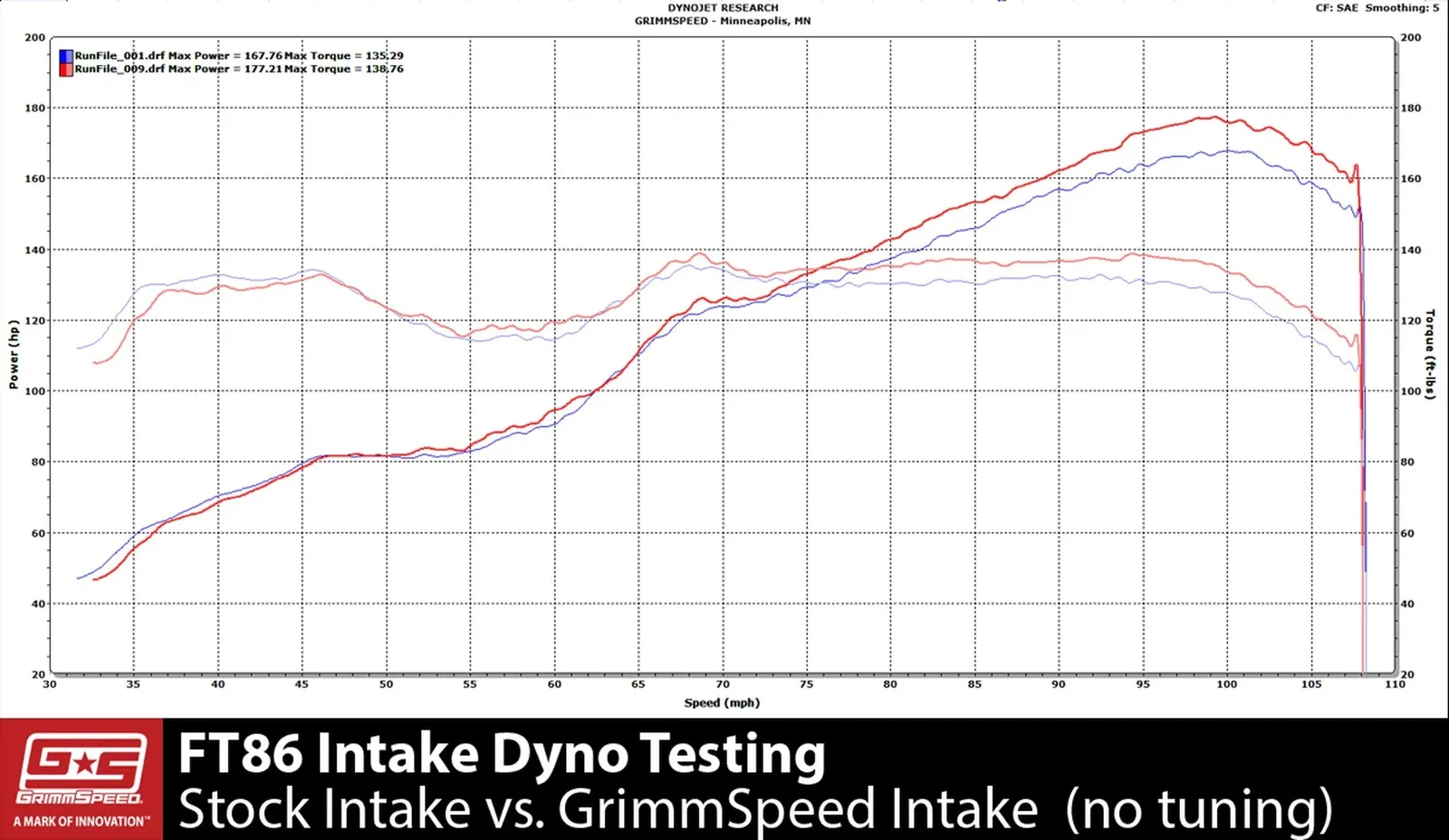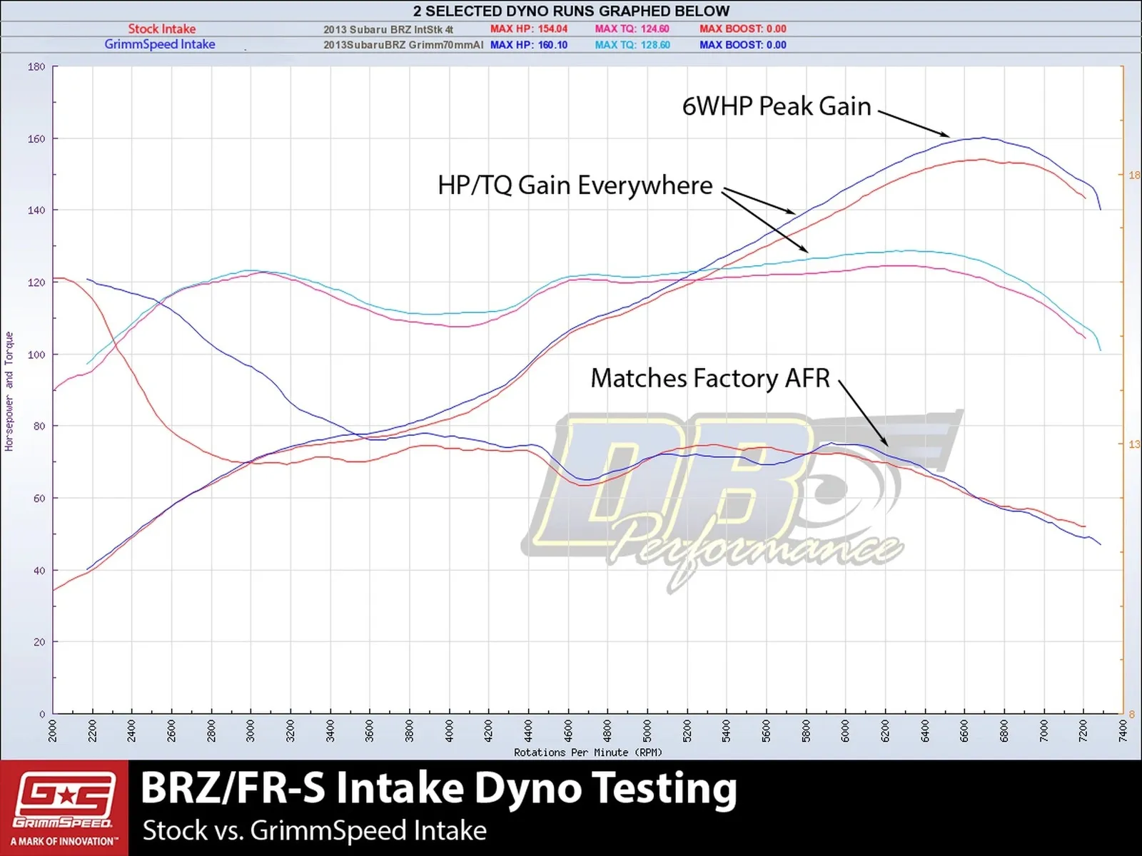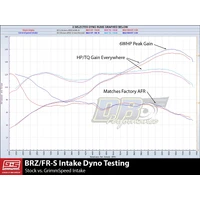 The intake provides gains in horsepower and torque across the entire rev range. This includes gains of 3-4 ftlbs in the "torque dip," and peak gains of 6 horsepower as measured at the wheels on a Dyno Dynamics dynomometer (reads lower than the common Dynojet). These gains are not achieved through MAF trickery either, as the air to fuel ratio remains nearly identical to the factory's. Additional gains in the top end can be achieved by modifying your factory snorkel (around 2whp) as shown.