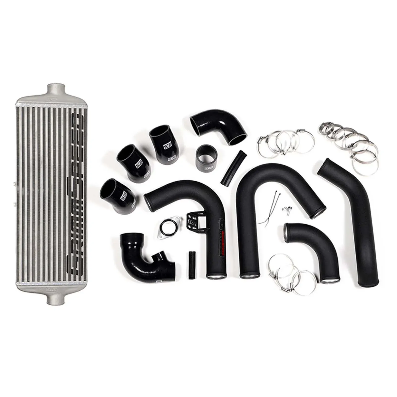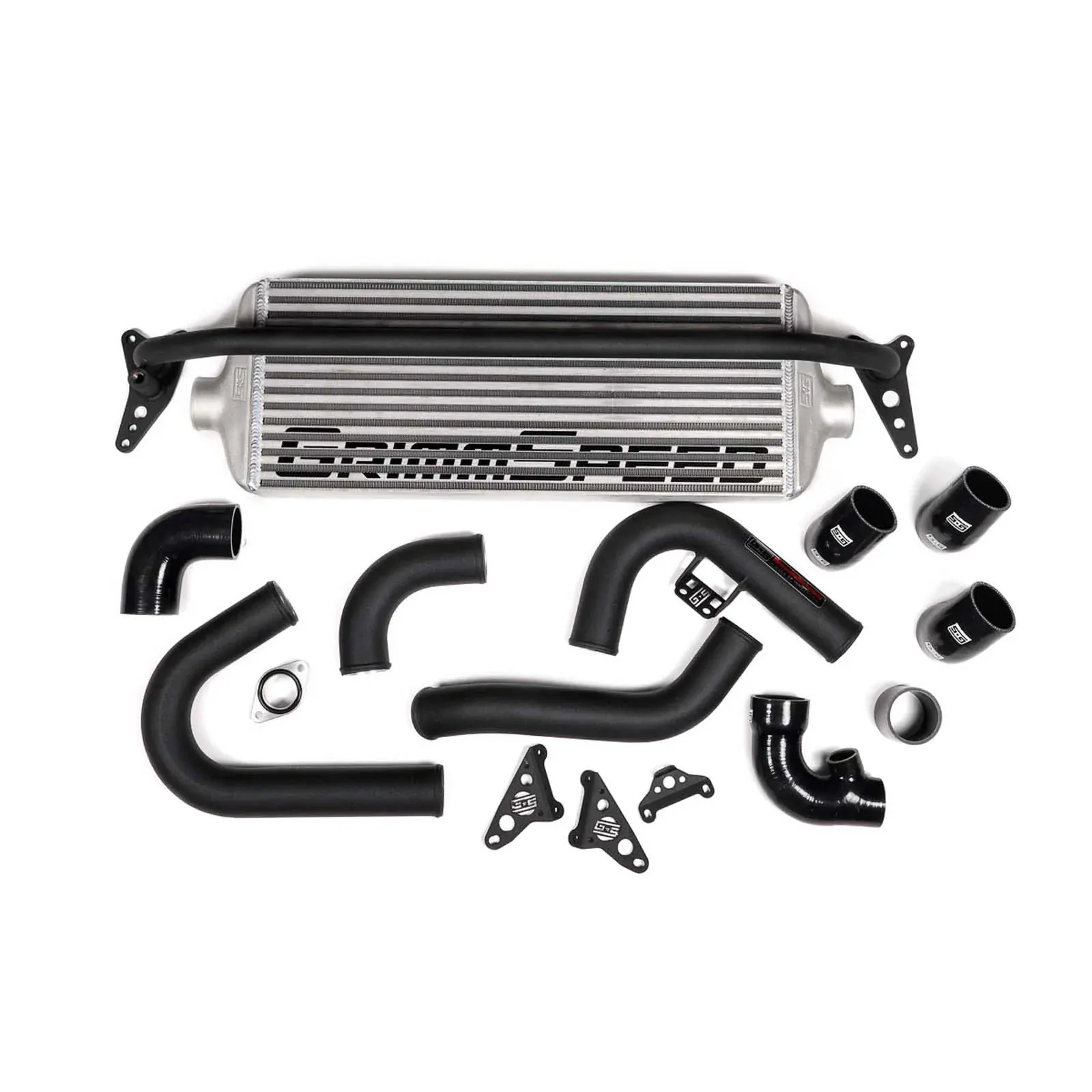 This is the GrimmSpeed Front Mount Intercooler Kit. This is the latest offering from GrimmSpeed and has been designed with a great balance of low-pressure drop and high-temperature rejection to provide optimal performance for a turbocharged engine. This intercooler kit is very beneficial for those of you with minimal to moderate modifications as those modifications will surpass the cooling capacity and limits of your factory top mount intercooler.