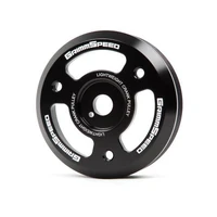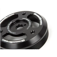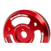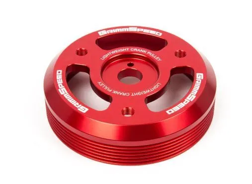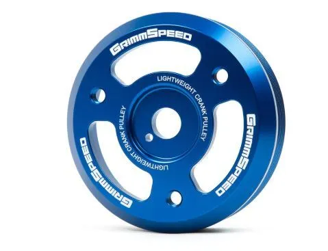 Submit A RequestYour factory crank pulley is responsible for transferring energy from your crankshaft to your water pump, a/c compressor and alternator. It does this by way of a rubber belt and it does it's job well. The drawback to the factory pulley is that it's quite heavy. Reasons for this include less expensive manufacturing and using the pulley's mass to smooth out 'noise' in the accessory system (NOT to be confused with functioning as a harmonic dampener, which it does not). The GrimmSpeed Lightweight Crank Pulley reduces the rotational mass of the system, allowing your engine to accelerate and decelerate the rotating assembly more quickly.
