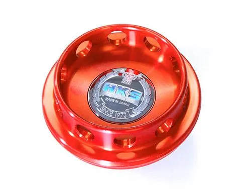 "Billet Oil Filler Cap" for engine compartment dress-up in a simple way. This HKS Billet Oil Filler Cap is made of aluminum alloy (Duralumin) with red Alumite treatment. It accentuates the shows of the engine compartment.
