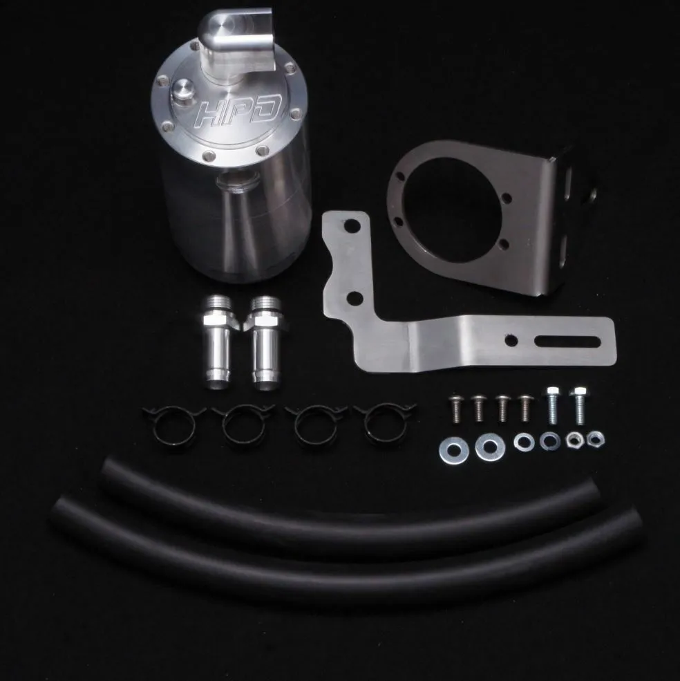 HPD’s oil catch can / oil separators come in universal and complete kits with all required stainless steel laser cut bracketry, correct size hose tail fitting, washable internal stainless mesh filters, cut to size oil resistant hosing, bolts, nuts, washer, spring clamps and installation instructions for each vehicle.