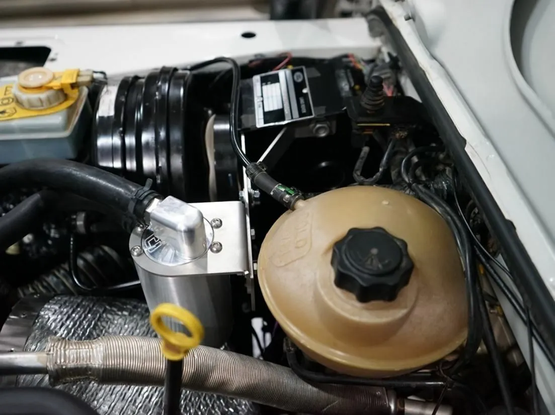 The landrover defender catch can kit sits neatly on the drivers side of the engine bay up near the brake booster. using a stainless steel laser cut bracket system this kit is firmly held in place with a 45° support bracket.