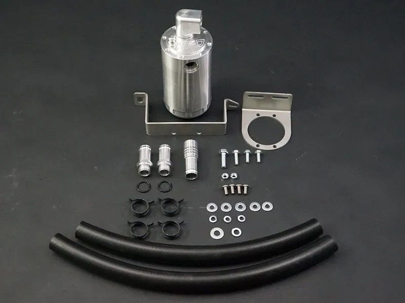 HPD’s oil catch can / oil separators come in universal and complete kits with all required stainless steel laser cut bracketry, correct size hose tail fitting, washable internal stainless mesh filters, cut to size oil resistant hosing, bolts, nuts, washer, spring clamps and installation instructions for each vehicle.