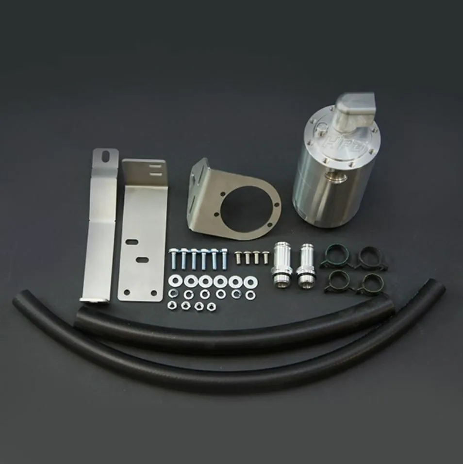 HPD’s oil catch can / oil separators come in universal and complete kits with all required stainless steel laser cut bracketry, correct size hose tail fitting, washable internal stainless mesh filters, cut to size oil resistant hosing, bolts, nuts, washer, spring clamps and installation instructions for each vehicle.