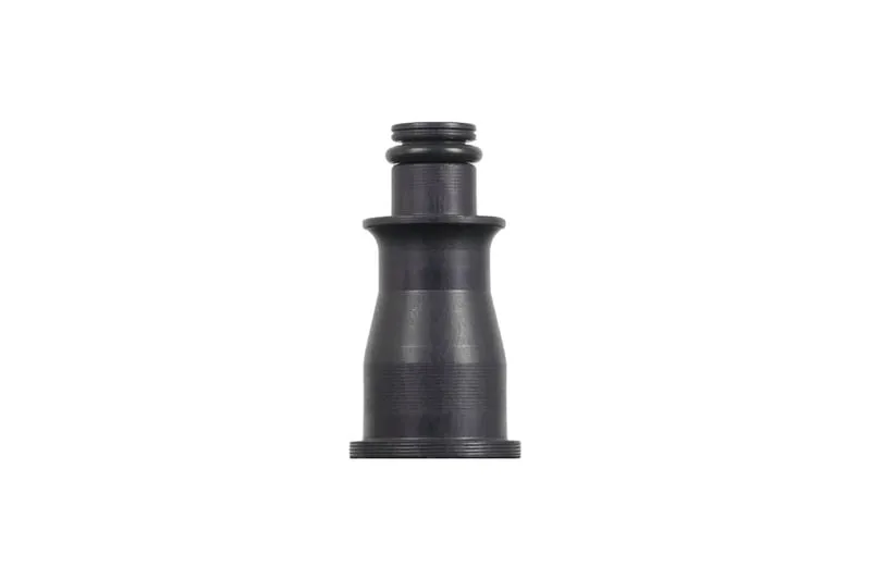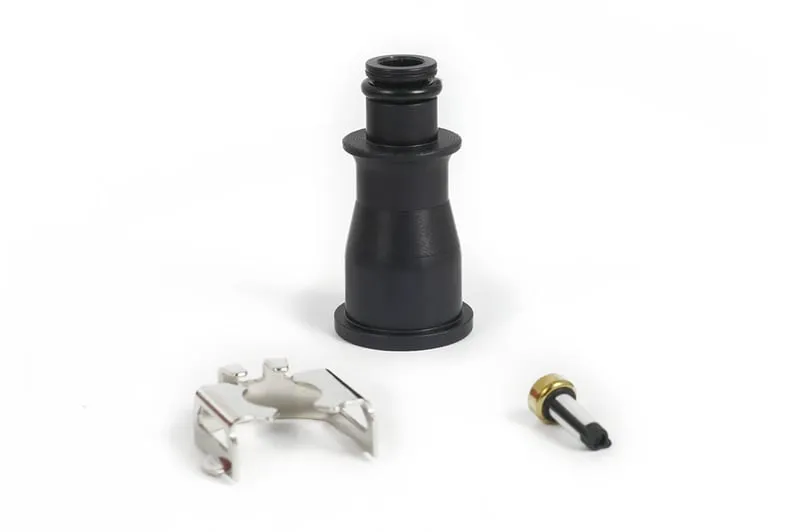 This fuel injector adapter allows a 1/2 length (34 mm) injector with a 14 mm top O-ring, to be installed as a full-sized (60 mm) injector, fitting a fuel rail with a 10.5 mm O-ring bore.