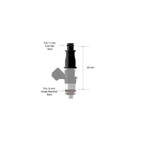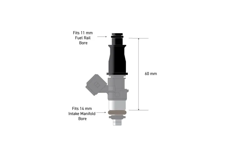 This fuel injector adapter allows a 1/2 length (34 mm) injector with a 14 mm top O-ring to be installed as a full-sized (60 mm) injector, fitting a fuel rail with an 11 mm O-ring bore.