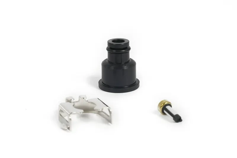 This fuel injector adapter allows a 3/4 length (48 mm) injector with a 14 mm top O-ring to be installed as a full-sized (60 mm) injector, fitting a fuel rail with an 11 mm O-ring bore.
