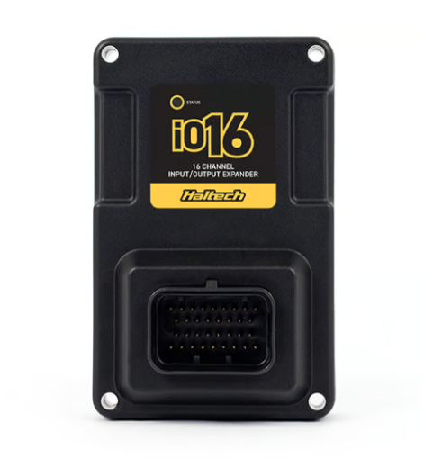 The Nexus IO16 is a Haltech CAN device that expands the functionality of a Haltech Nexus or Elite ECU by adding 16 user-configurable input and output channels, accessible through the Haltech CAN system.
