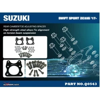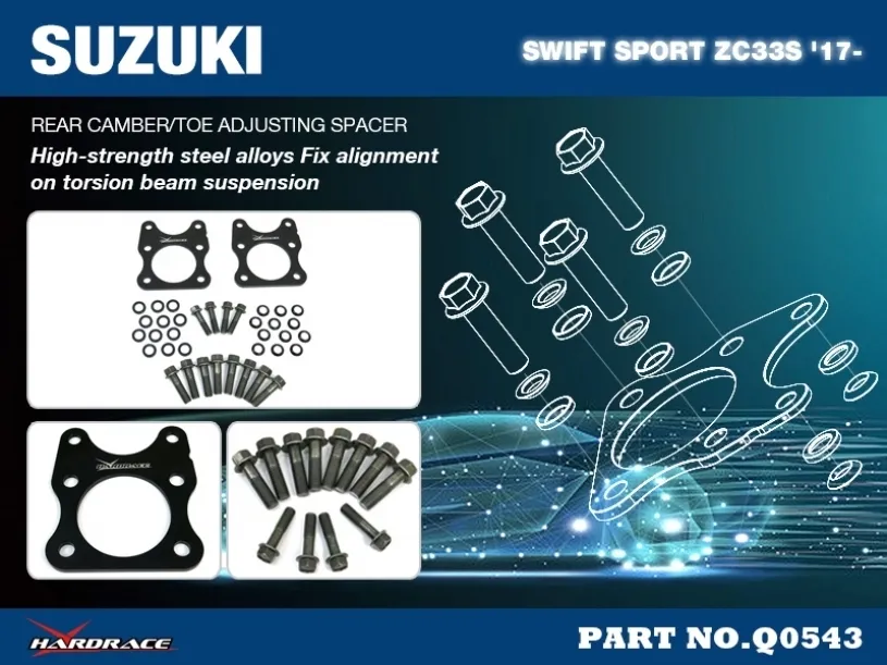 The OEM rear torsion beam of Swift does not allow for any alignment changesHARDRACE rear adjusting spacer can help you to reduce the rear toe degree easily. By replacing the factory caliper mounting bracket and install the rear adjusting spacer, it will correct the toe-in to normal of lowered car.
