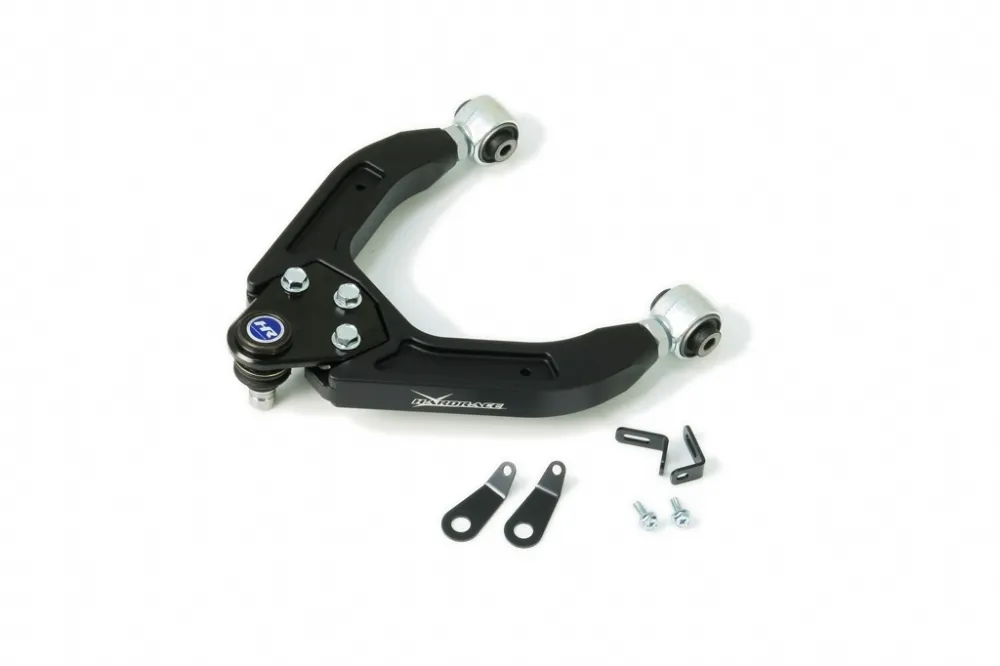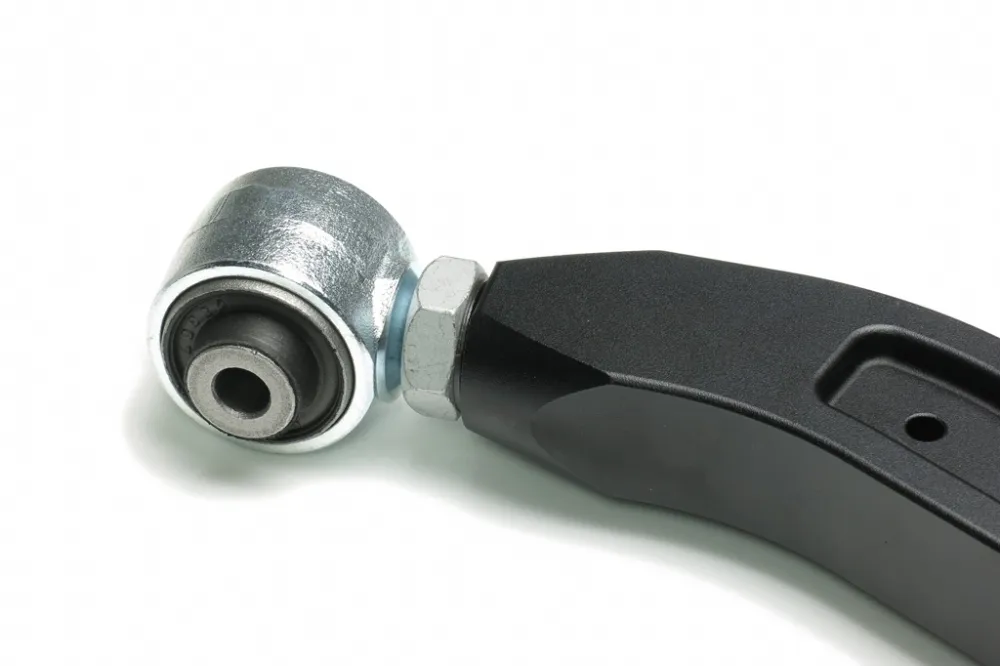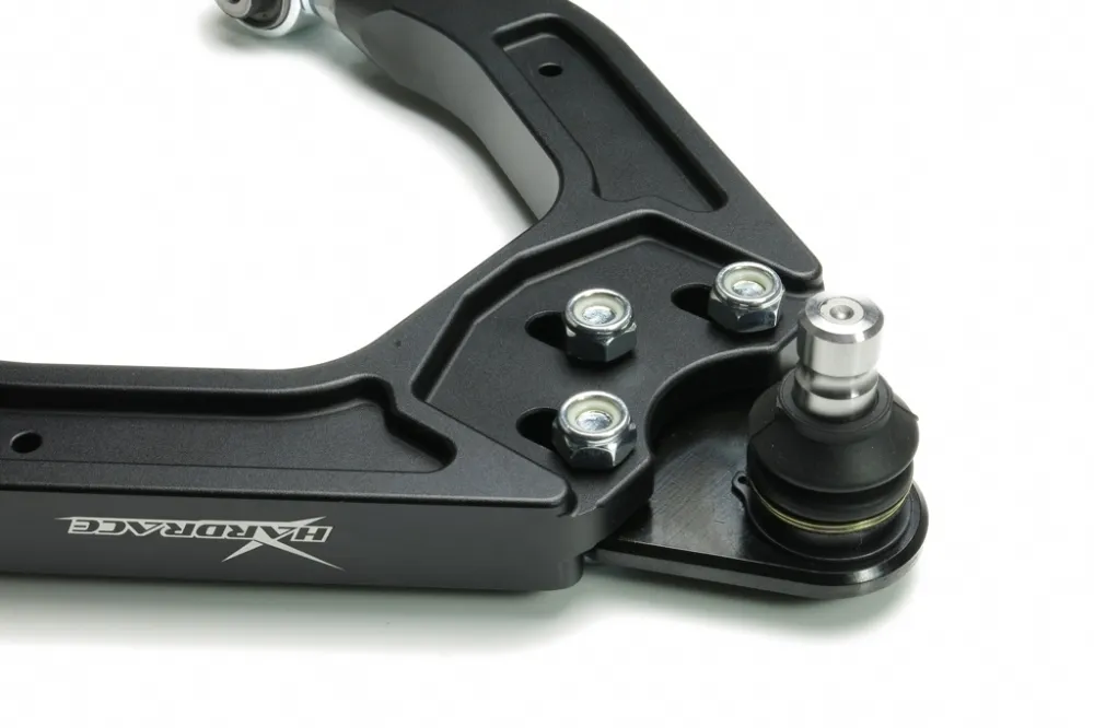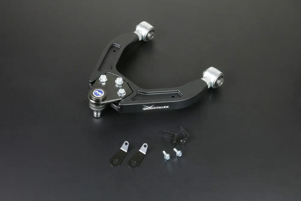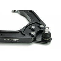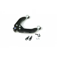 Front upper camber kit allows fine adjustments to the front end camber setting of the vehicle. It can either help improve cornering grip or get your car back to original alignment specs after lowering. The arms are made of high-strength CNC aluminum with anodized surface to offer high durability, strength and yet remain light-weight. With high quality harden rubber bushings and ball joints equipped, they also provide greater handling response over the factory components.
