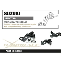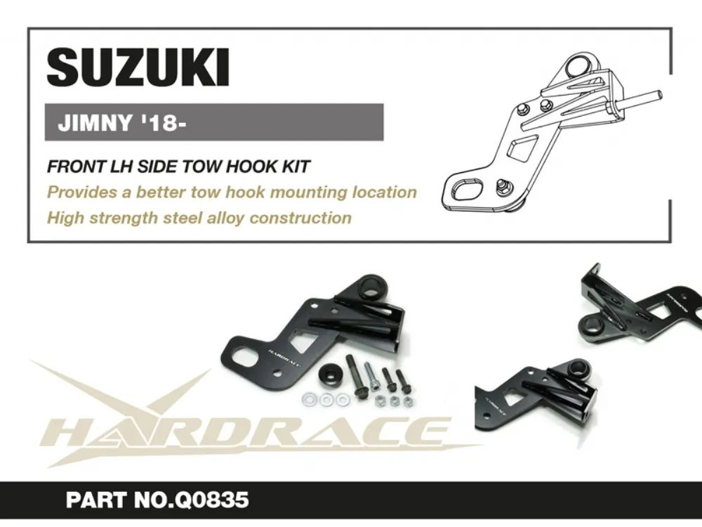 Hardrace is proud to announce the tow hook / recovery point for JB64/JB74 Jimny. The tow hook features ED-coated high strength 10mm thick steel alloy construction to withstand heavy towing loads and harshest environmental conditions. Mounted to the frame rail and factory tow point, it not only extend the tow point for easier access and sportier looking, but also strengthens up the factory tow point welding structures and prevent risks of damaging front bumper, offering a safer towing option to your vehicle, definetely an essential for offroad cars.