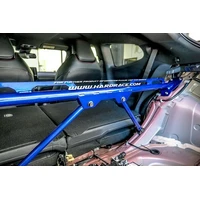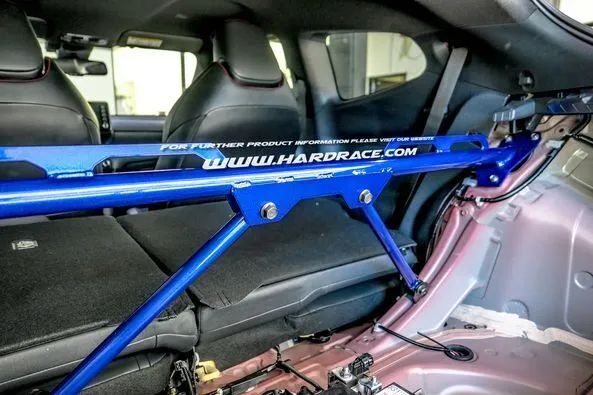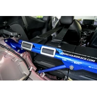 Introducing the rear strut harness brace for GR Yaris. The brace features high strength tubular steel construction, designed to help route and attach seat belt harnesses safely and securely without removing back seats. It also helps improve chassis rigidity by tying the car's B-pillar points together, offering greater stability and handling performance.