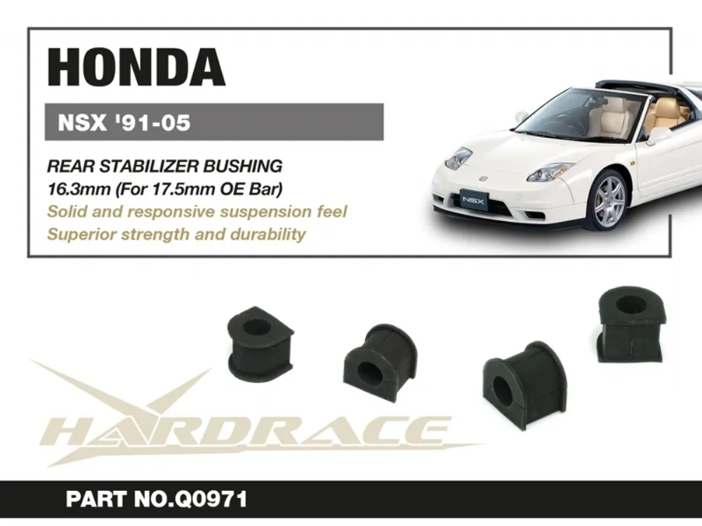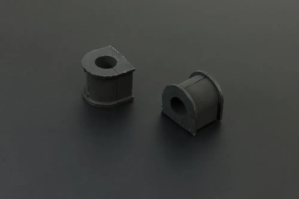 Hardrace reinforced stabilizer bushings are made of exclusive thermoplastic material for increased strength and hardness, oil/alkali/ozone resistant properties and self-lubricated function. Unlike ordinary NBR that tends to break easily or polyurethane that often causes squeaks and harsh rides, these bushings can achieve a perfect balance between the two, offering superior suspension response and durability while maintaining great ride quality.