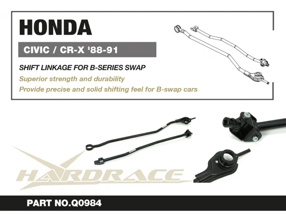 The shift linkage kit is designed to fit Civic and CR-X '87-91 when swapping to B-Series engine. It features high strength steel tubular construction for more direct motion of shifting, a must have for your B-Swap Civic/Integras.