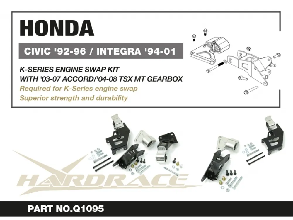 The engine mount kit is required when performing a K-series engine swap into Civic EG/Integra DB6~DC2. It features 5mm thick steel alloy construction for the brackets, offering superior strength and durability to withstand higher horsepower and torque output. With the reinforced soild ruubber bushings, this kit also capably eliminate unwanted vibrations and flex of the mountings under hard acceleration, braking and cornering, ensuring the maximum transfer of power to the wheels.
