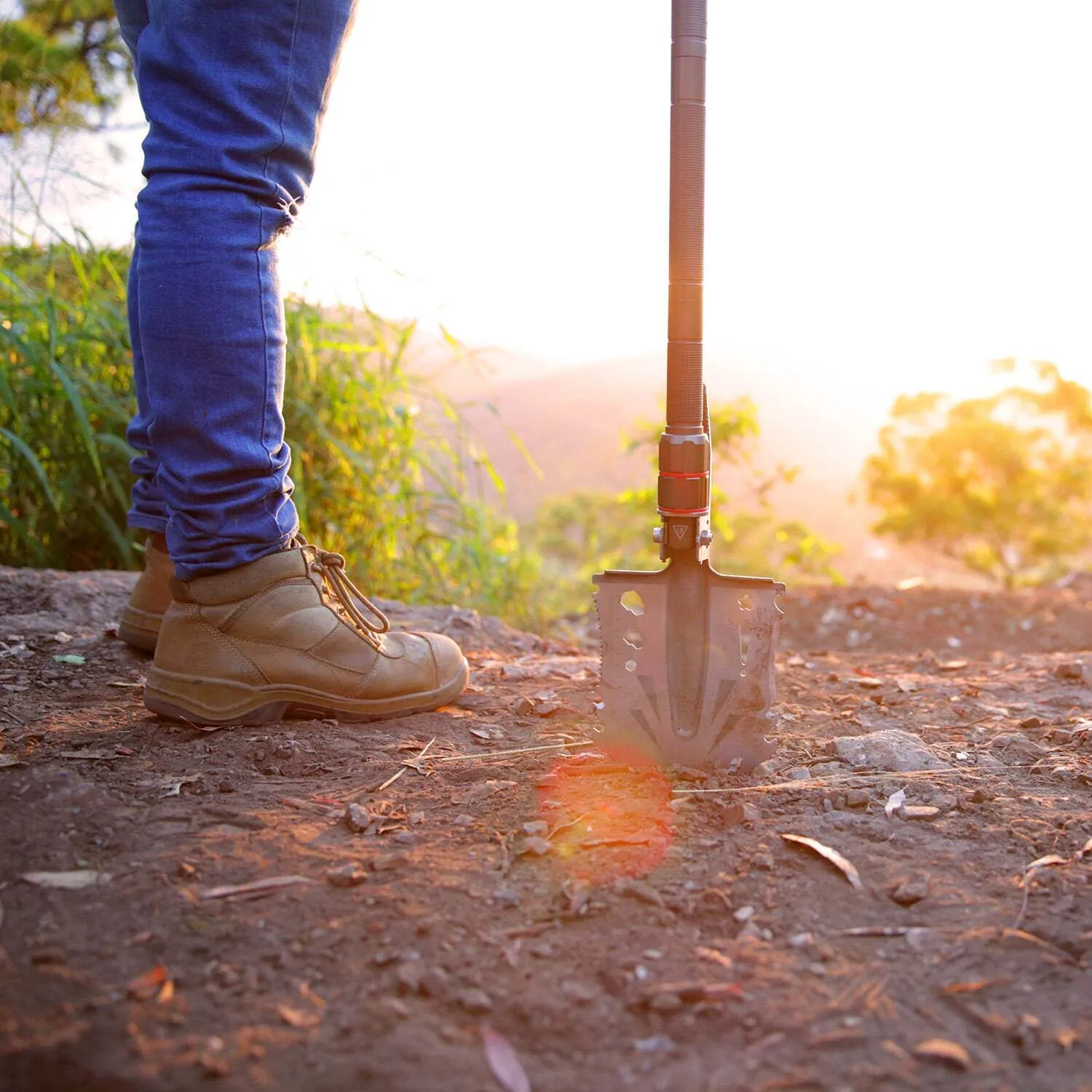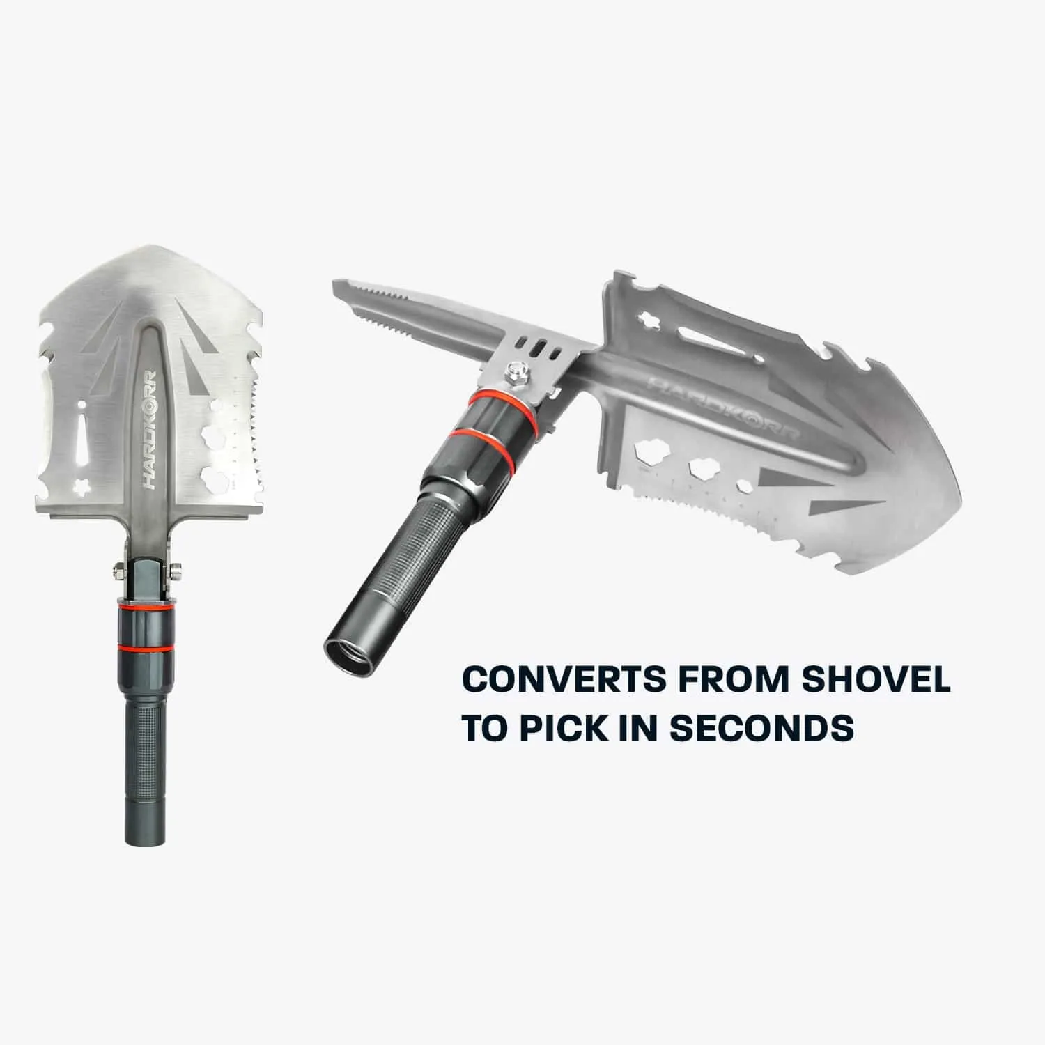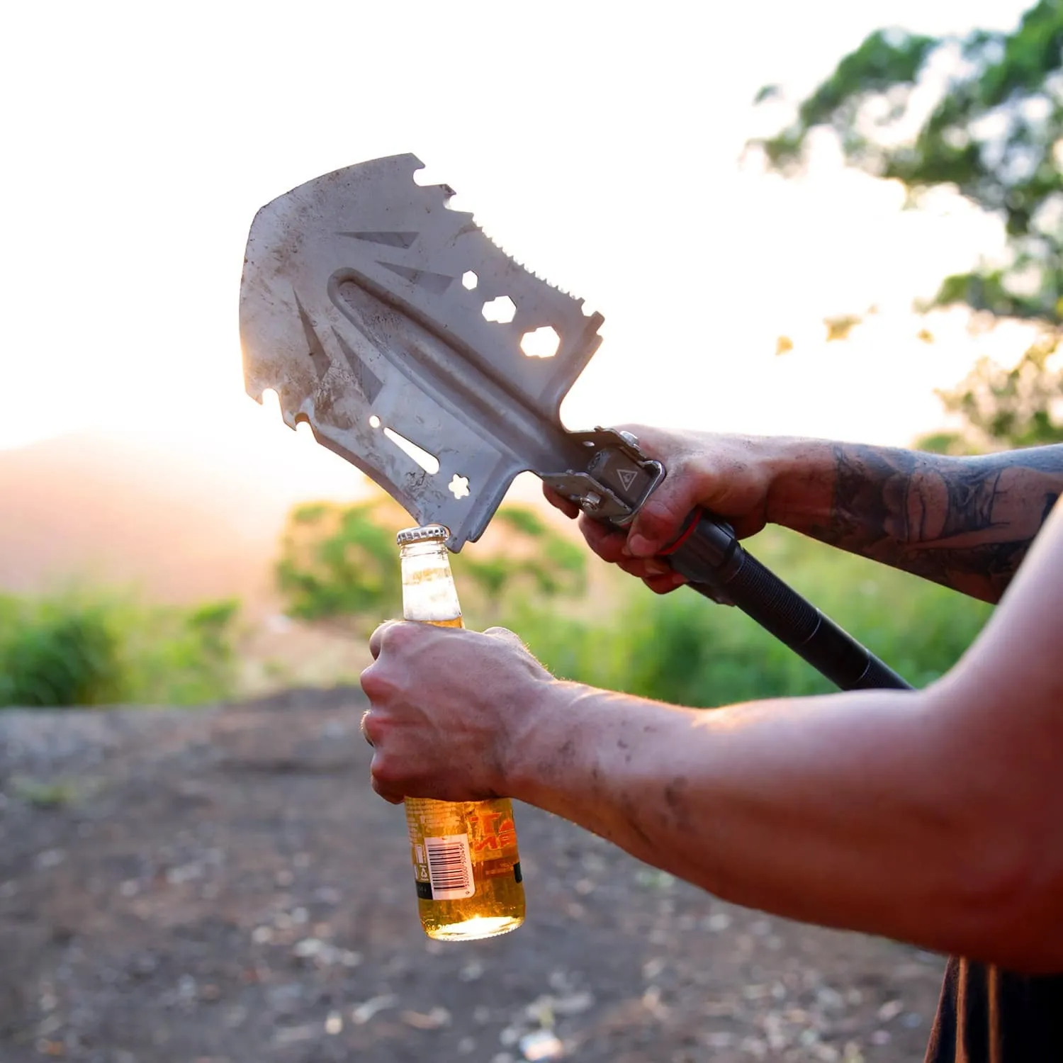Versatile just doesn’t even begin to describe this thing. You can dig holes, you can shovel dirt or snow, you can chop branches, you can cut vegetables, you can saw wood, you can catch fish, you can undo bolts, you can tighten bolts, you can open bottles, you can start a fire, you can undo screws, you can tighten screws, you can hammer nails, you can remove nails, you can measure things, you can cut rope, you can cut wire, you can scale fish, you can break glass, you can break up ice or hard ground, you can turn it into a hoe to remove plants or weeds that are in your way, you can dig out bogged vehicles, and you can use it as a hiking pole. There’s probably more uses, but we’ll leave that up to your imagination!