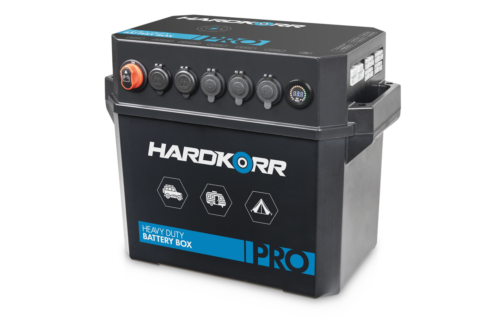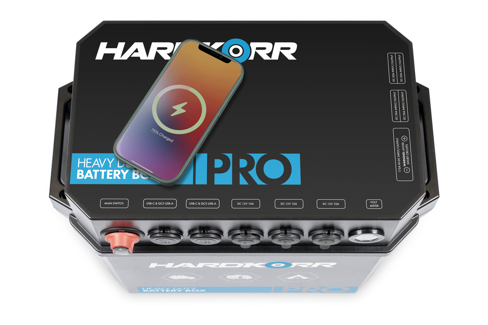 The Heavy Duty Battery Box Pro model gives you more ways to utilise your auxiliary battery power. It comes with an integrated wireless charger, and a wire array of ports, plugs and sockets to give you the power you need, however you need it.