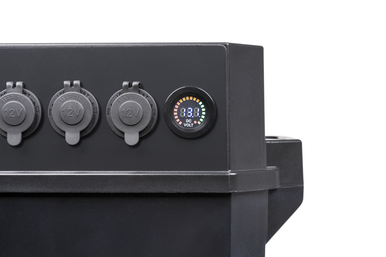 The battery box can accommodate batteries of all chemistries up to 330mm x 180mm x 240mm in size. It's durable ABS construction is built to last and all ports are recessed to resduce the risk of breakage. You'll find three 12V lighter sockets with 10A fuses, two dual USB-C and QUick Charge USB-A ports, four 50A Anderson style plugs, and a 175A Anderson-style plug for jump-starting, and a three coil wireless charging pad.