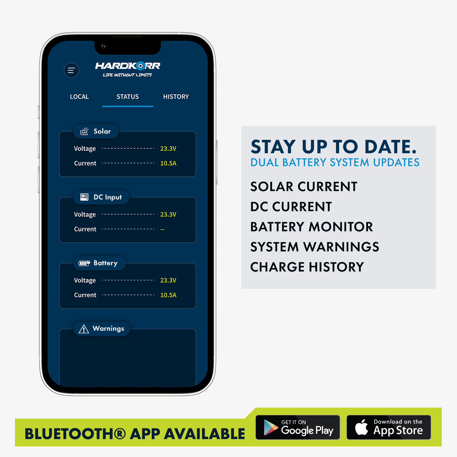 Our DC-DC is compatible with the “Hardkorr DC-DC Charger” app, available on the Google Play and App Store. At the press of a button, the app will give you access to a live feed on your batteries, solar and DC input.