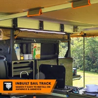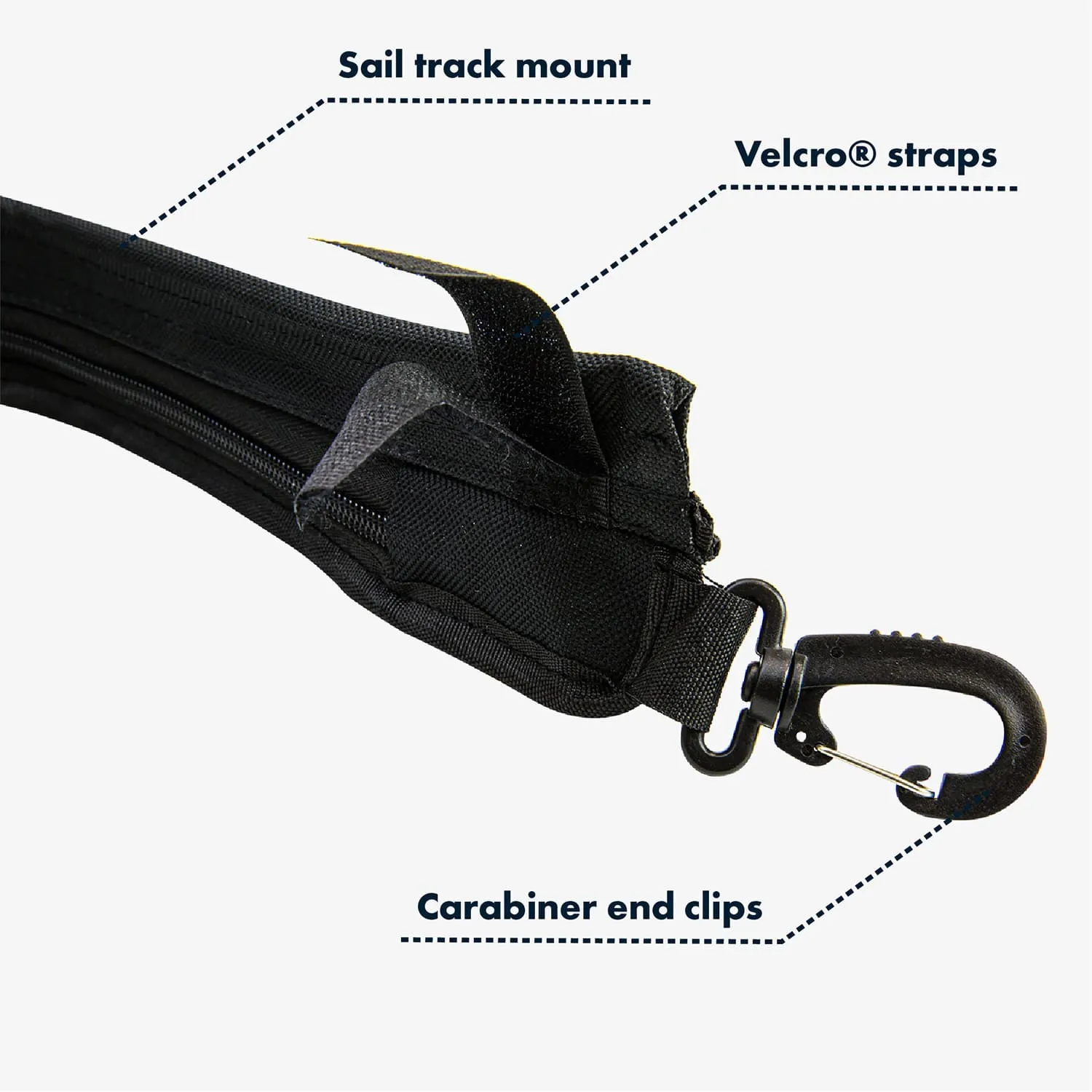 Velcro® strips (sewn into the canvas) and quick-connect carabiner end clips are included into the design to make mounting of the light easy. Or, if you have an awning or annex with a sail track, you can use the inbuilt sail track mount on the strip to slide straight in!