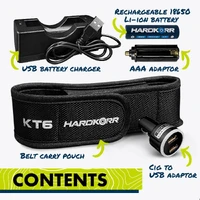 The KT6 comes with a heap of accessories including carry pouch, USB battery charger, cig-to-USB adaptor, and a AAA battery adaptor cartridge in case you want to run the torch off AAA batteries instead.