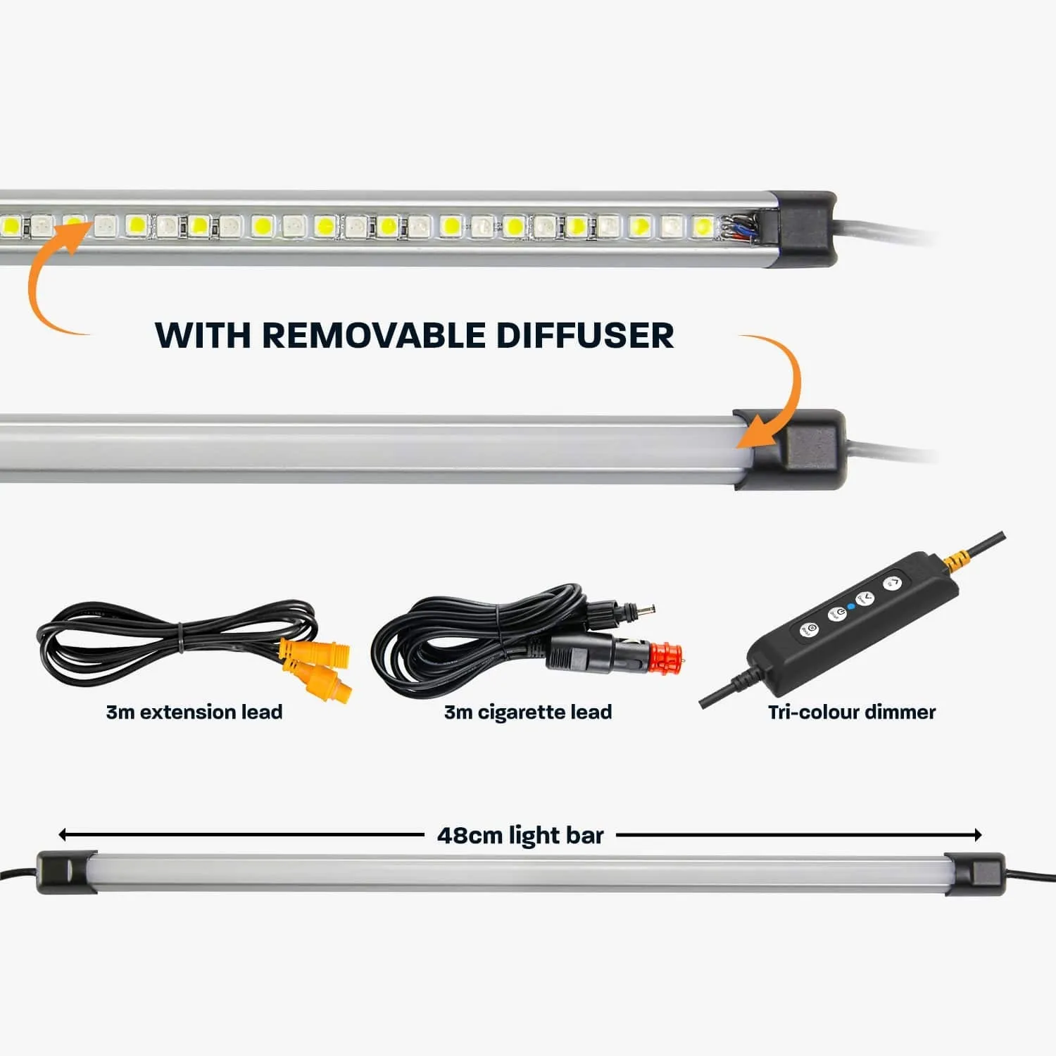 This 50cm tri-colour LED camping light bar is our most popular and versatile size. It is commonly used for campsite lighting and illuminating the side doors of touring canopies.
