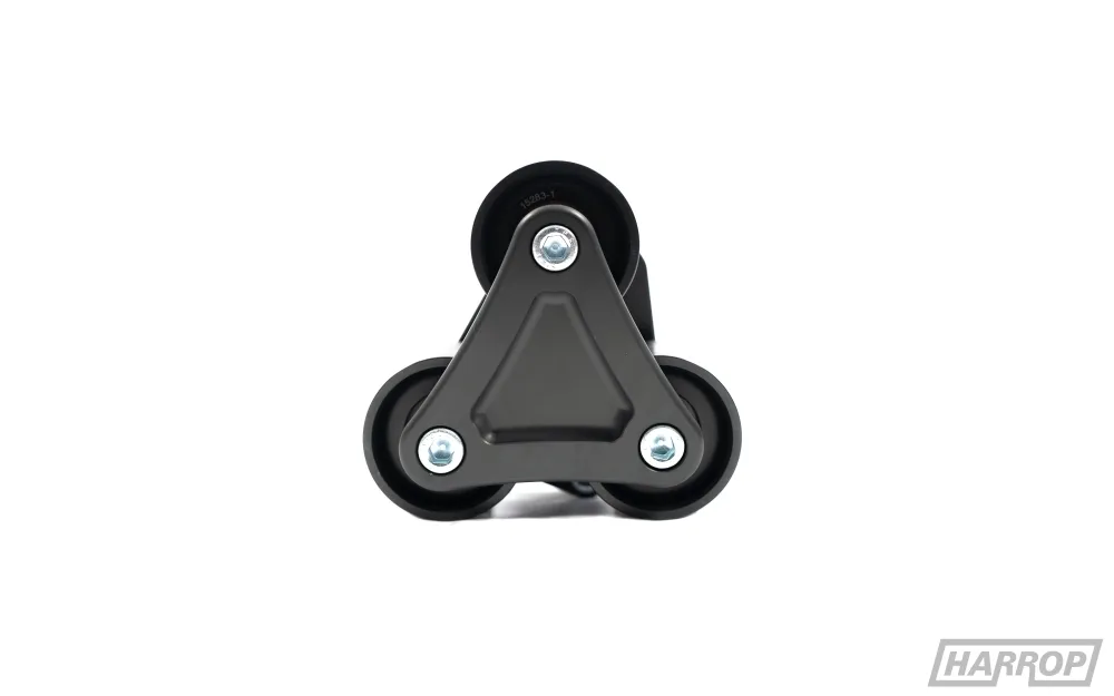 The Harrop 12PK drive system has been designed to fit the standard ATI balancer available for the LSA engine. There are 2 crank pulleys available and when combined with the supercharger drive pulley will provide progressive increase in supercharger RPM, refer to 12PK H2650i table. The new 3 idler mount provides increased belt wrap on the supercharger pulley again minimising slip. With the limited belts available this system must use the Harrop tensioner and in combination with different tensioner pulley diameters to provide enough tensioner travel/tension.