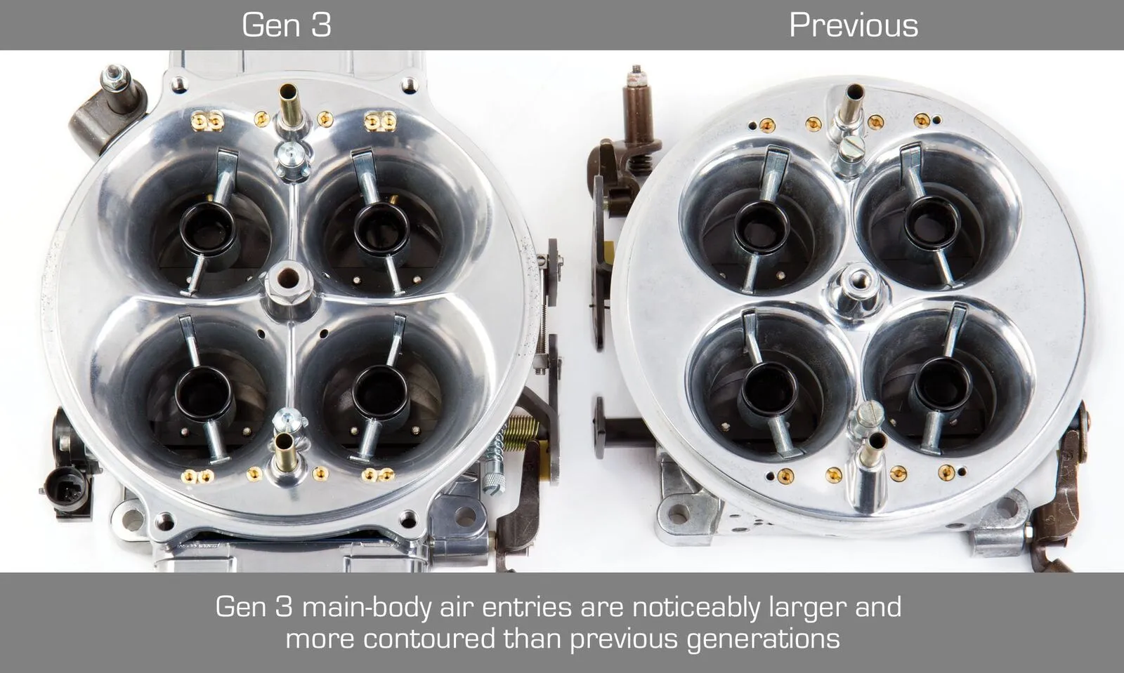 The patent pending GEN 3 mainbody is 5/16" taller than the previous generation! This new height allowed for larger radius air entries which were optimized using Computational Fluid Dynamics (CFD) software to deliver smoother flow into new fully machined, big bore venturii.