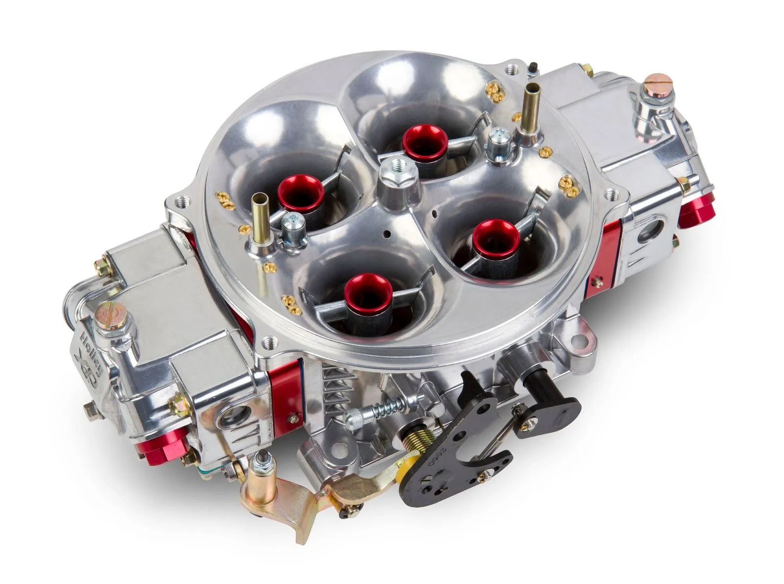 - Shiny with red anodized billet aluminum metering block and booster inserts