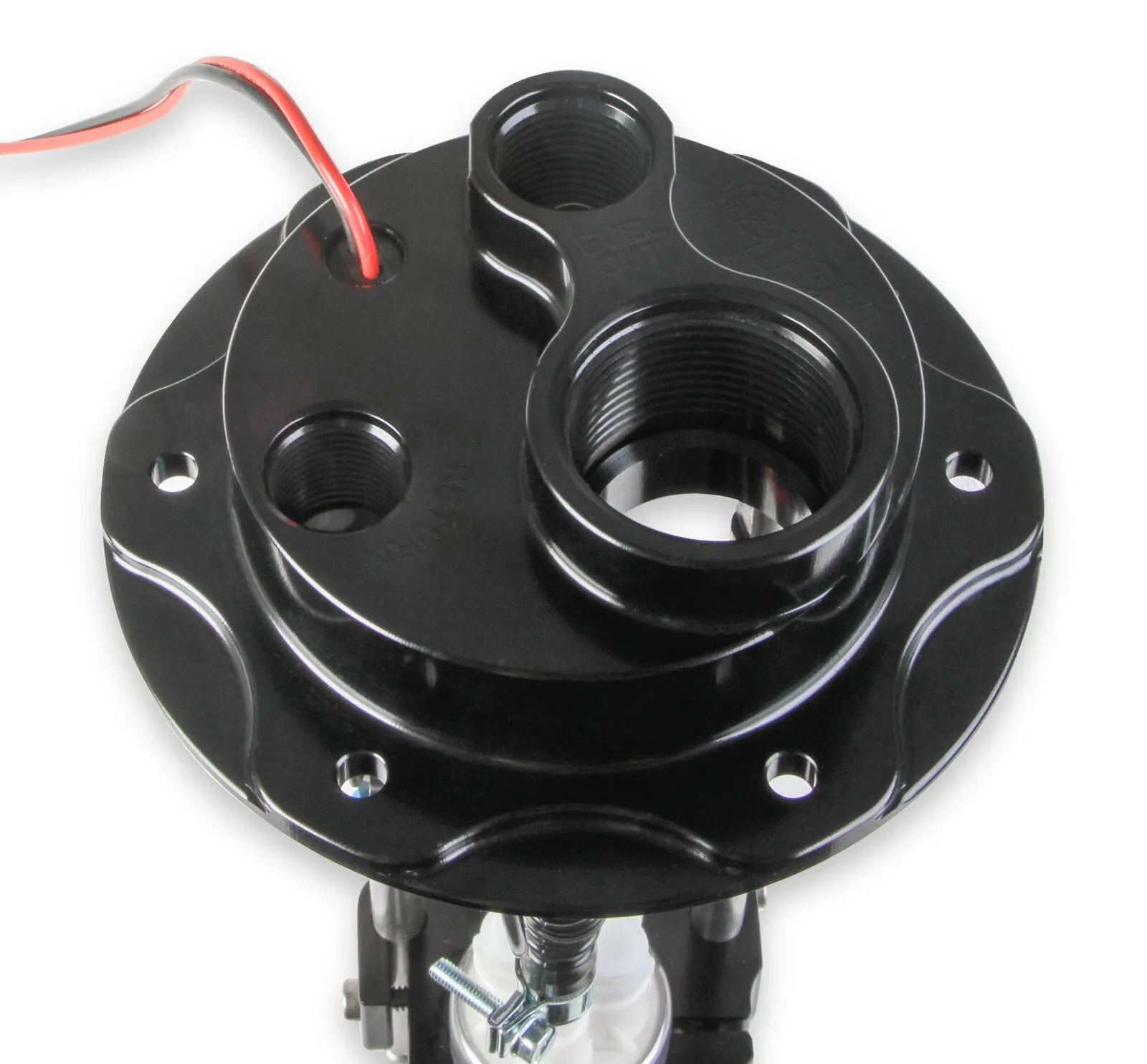 • Billet top flange housing includes an 8AN inlet and 10AN outlet port and a fuel filler cap
