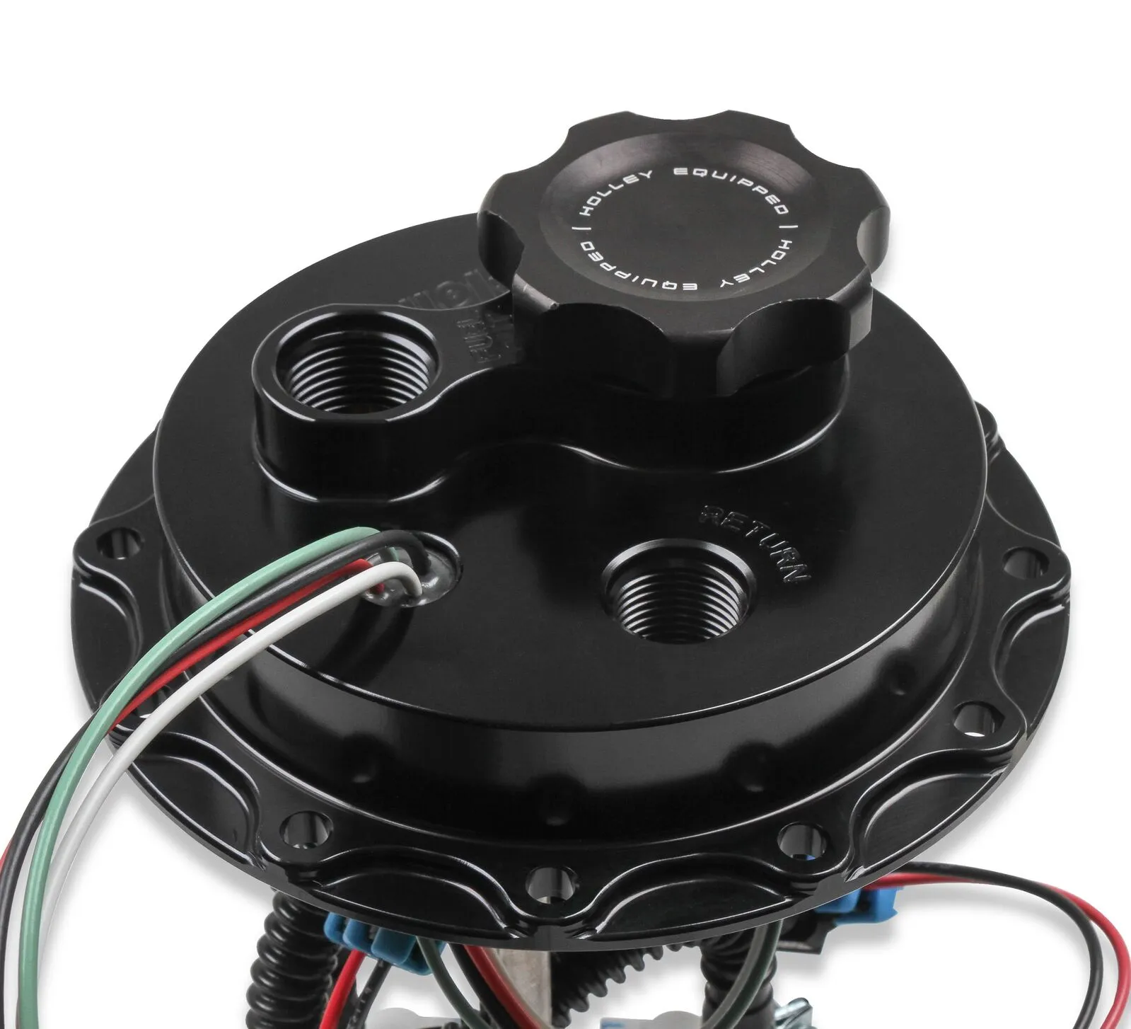 Holley is excited to introduce our Holley Fuel Cell EFI Pump Modules. While the name includes EFI, these modules can be used as an upgrade for carbureted systems as well with the proper regulator. The modules were designed to drop in as a direct replacement for your existing 12 bolt flange fuel cell cap assembly. The billet top flange includes an 8AN inlet port, a 10AN outlet port, and a fuel filler cap. The fuel pump depth is fully adjustable from 7.5" to 12" deep. The EFI modules are available with single and dual 255 LPH and 450 LPH fuel pumps. The module kits include all the hardware to install into your existing fuel cell. All that you need to add is your fuel line.